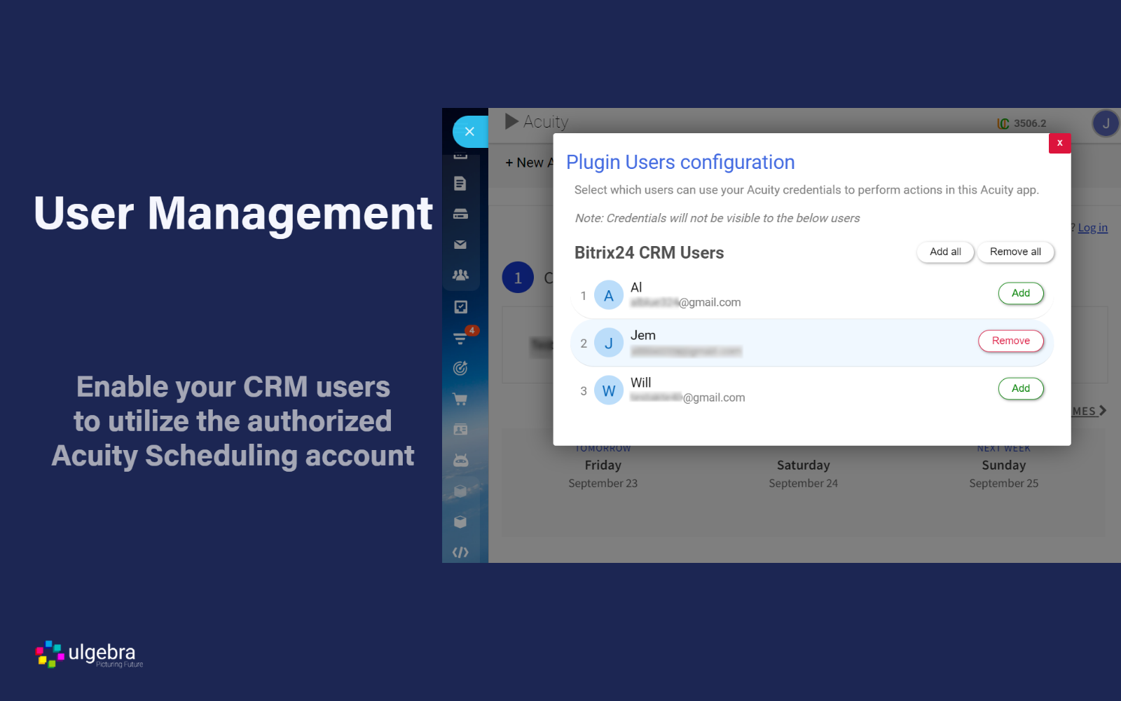 Permita que outros usuários do Bitrix24 CRM utilizem sua conta autorizada do Acuity Scheduling. Você pode adicionar e remover usuários com base em seus requisitos.