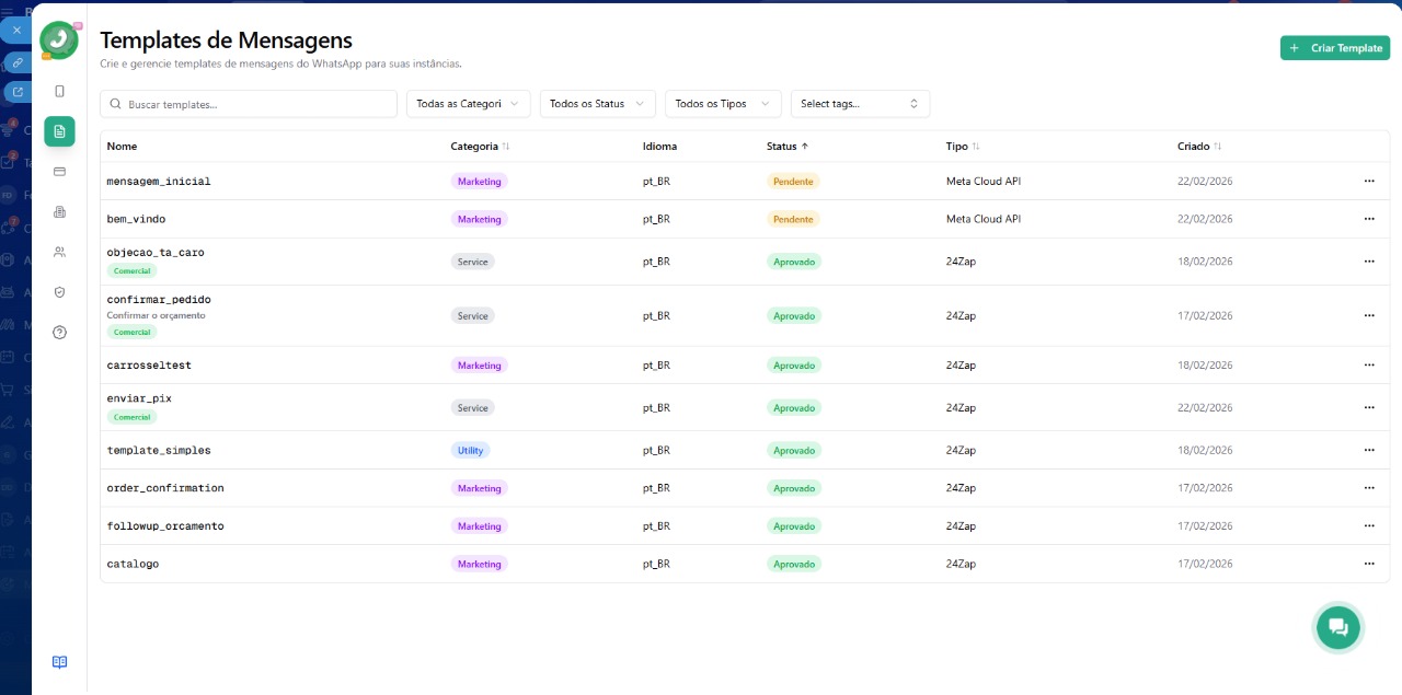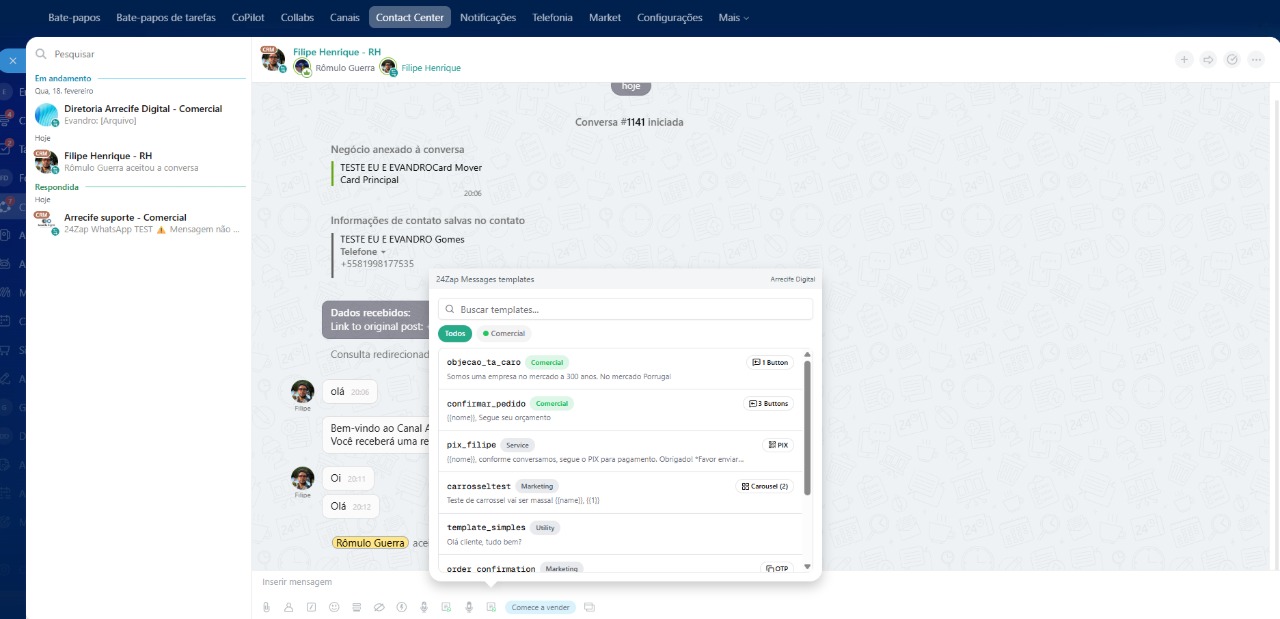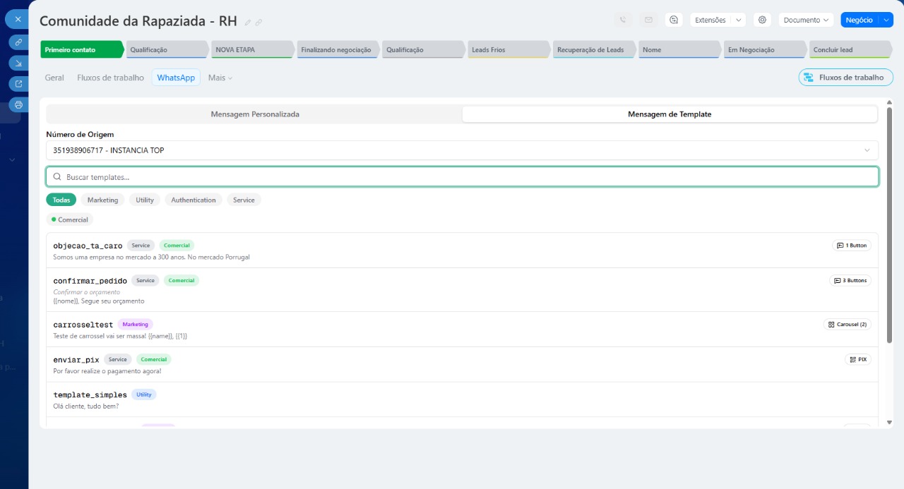 Templates de mensagens: envie modelos aprovados para iniciar conversas com rapidez e padronização.