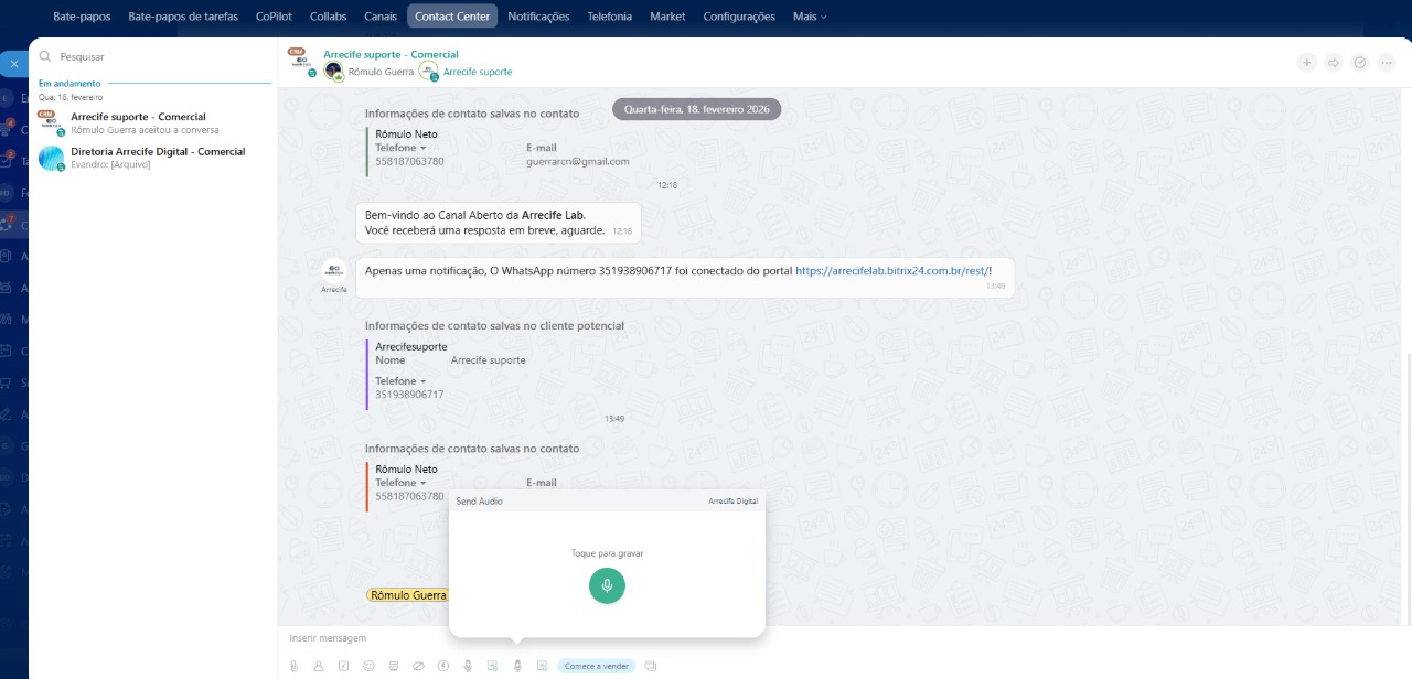 Envio de áudio nativo: grave e envie áudios diretamente na linha do tempo do cliente, como se estivesse no celular.