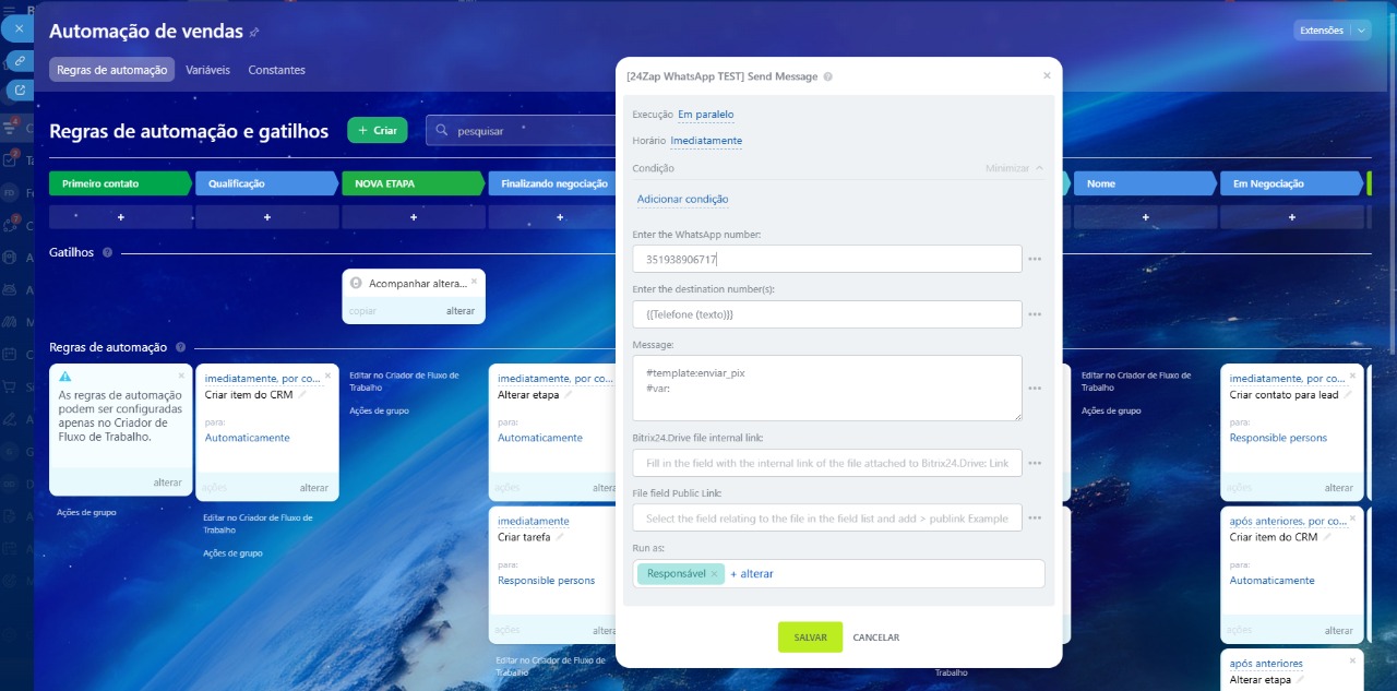 Regras de Automação no CRM: envie mensagens via regras de automação por dentro das automações do Bitrix24.