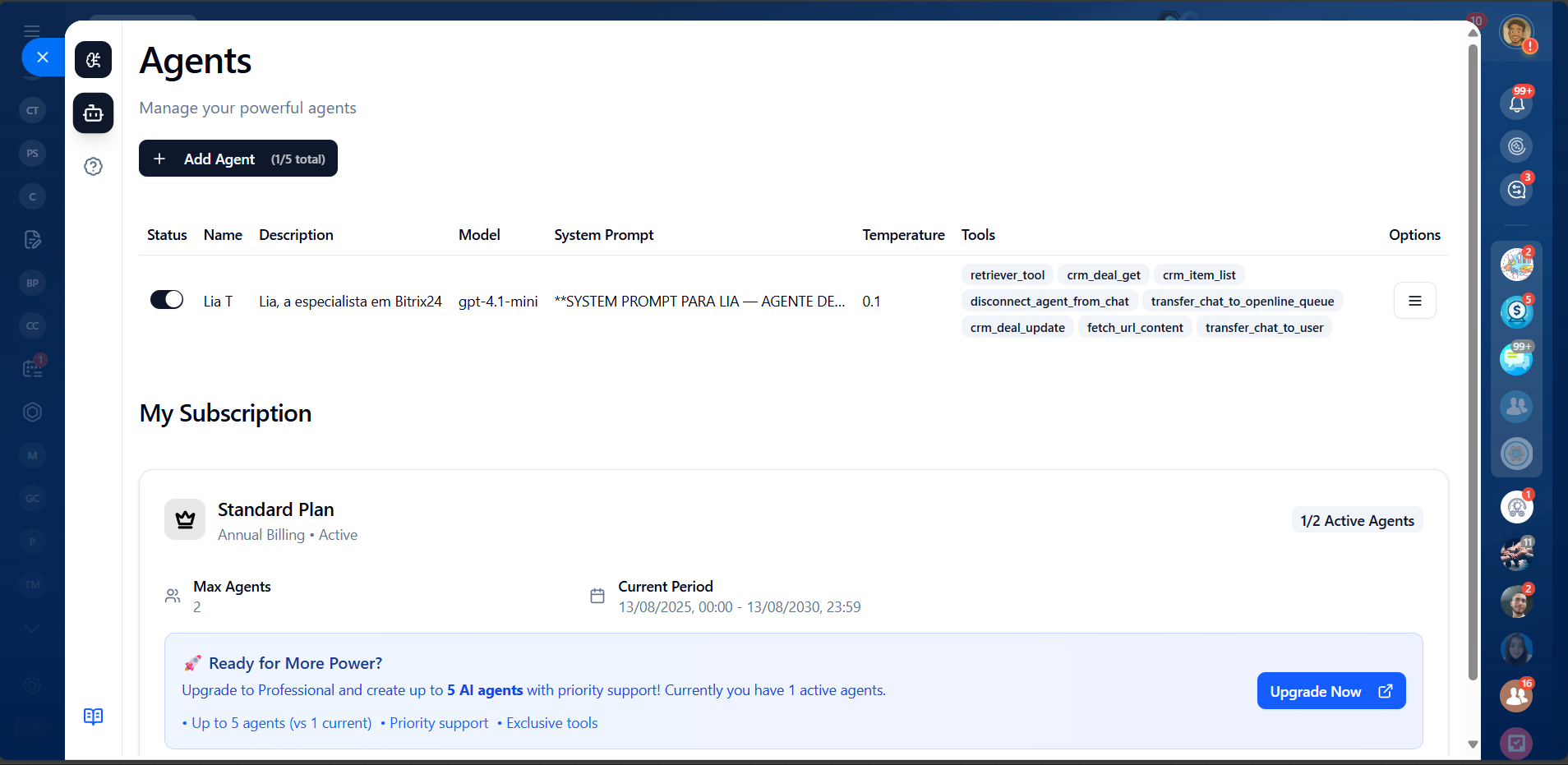 Standard – R$ 299,97/mês: até 2 agentes de IA