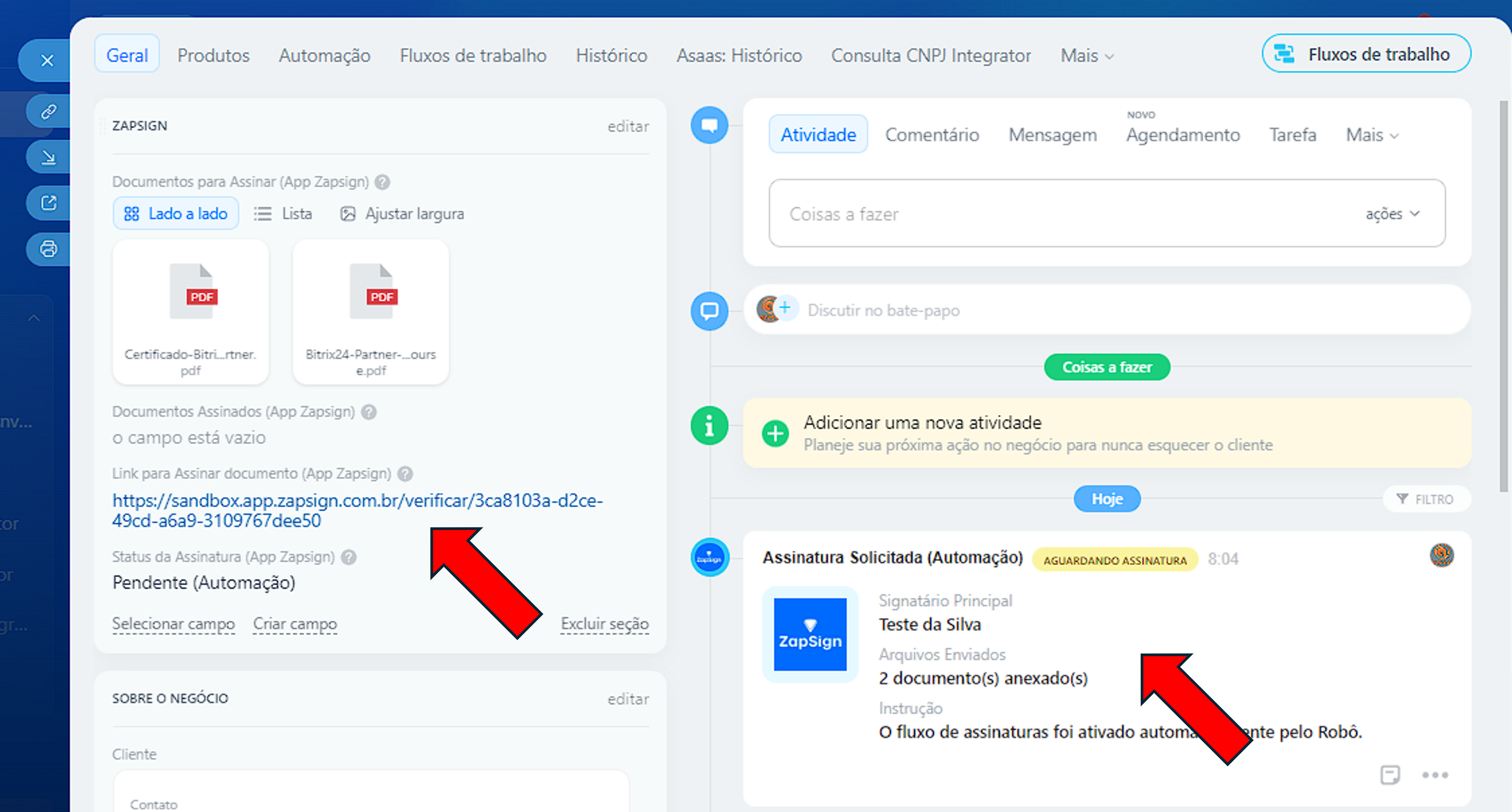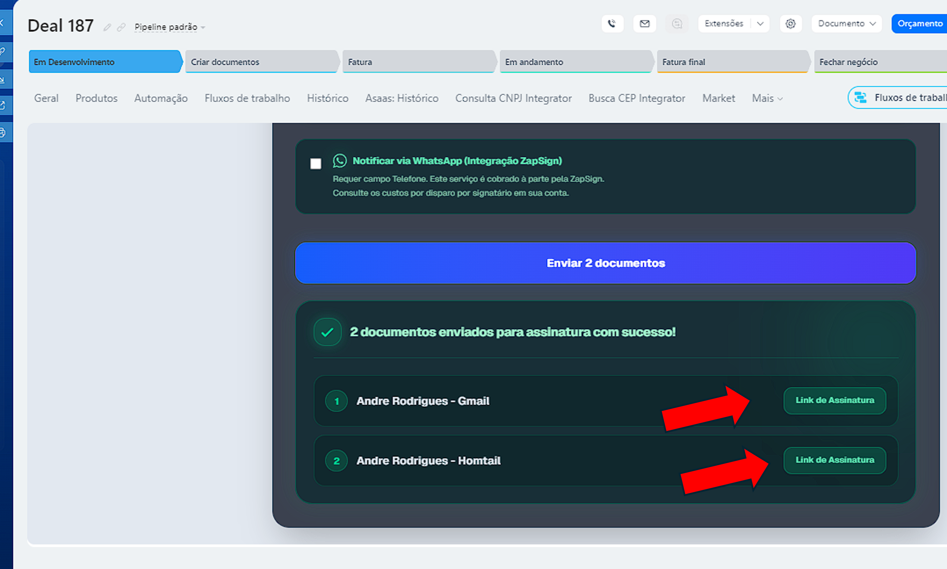 - Envio Direto do CRM: Selecione arquivos de campos do Negócio e envie para assinatura com um clique.