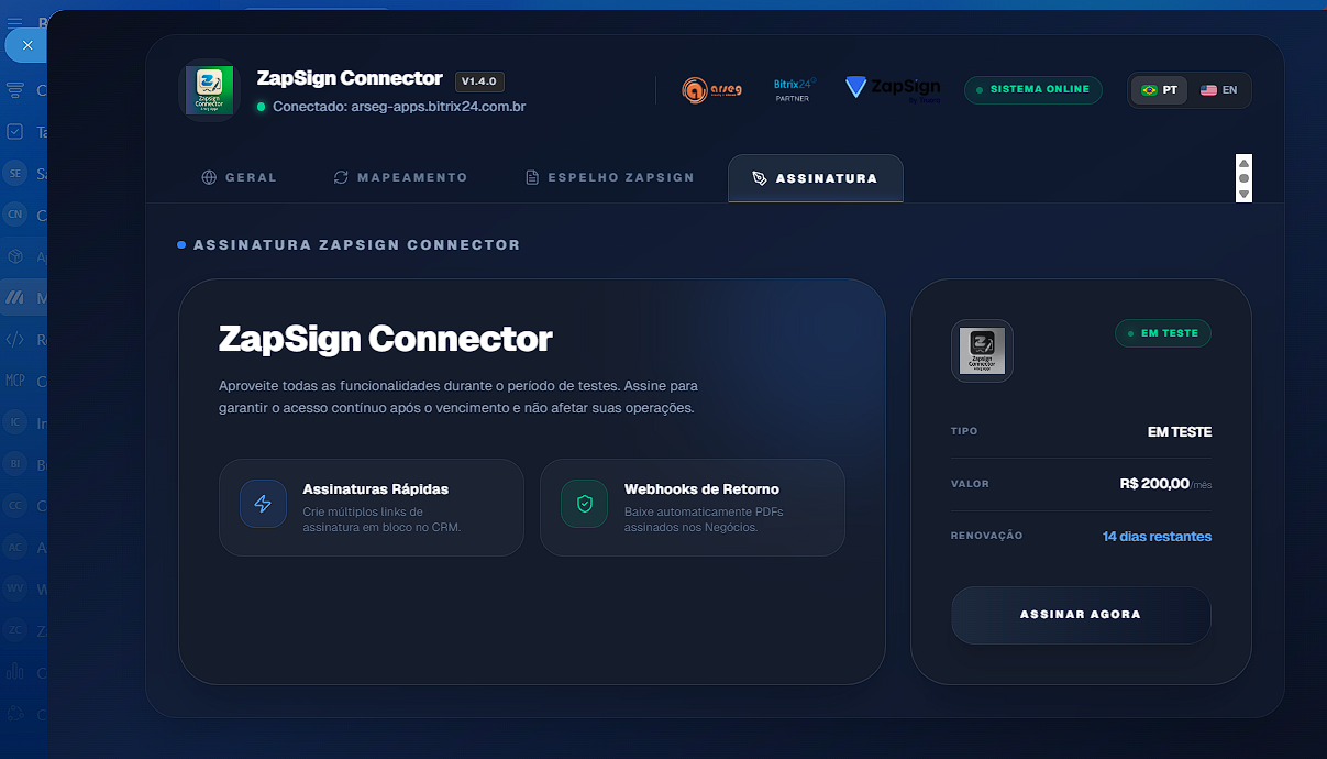 - Assinatura: Após o período de teste, você poderá assinar os planos disponíveis pelo link: https://arseg.bitrix24.site/aplicativos-bitrix24/