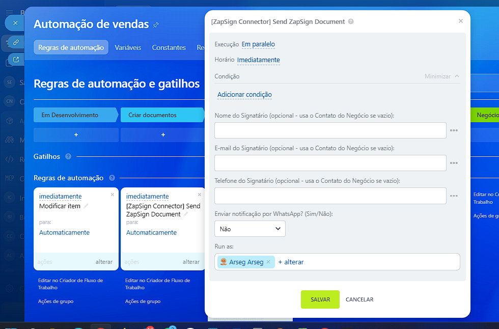 - Automação (Bizproc): Robô exclusivo para enviar documentos automaticamente quando um Negócio mudar de fase.