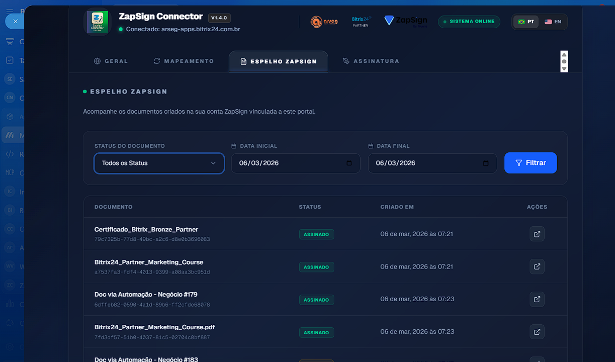 O ZapSign Connector integra nativamente o seu Bitrix24 à plataforma ZapSign, permitindo o gerenciamento completo de assinaturas eletrônicas sem sair do CRM. Esqueça o download e upload manual de arquivos; automatize seu ciclo de vendas e contratos de ponta a ponta.