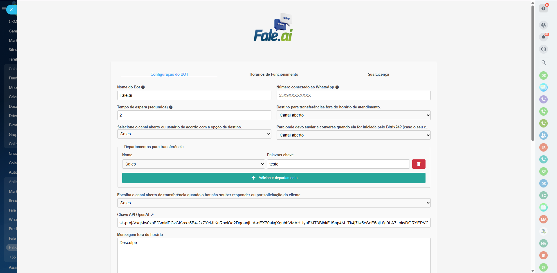 Por fim, mas não menos importante, o seu agente Fale.ai pode ser capaz de entender e responder mensagens de áudio recebidas (a resposta será em texto). Este é um módulo opcional que deve ser contratado separadamente.
