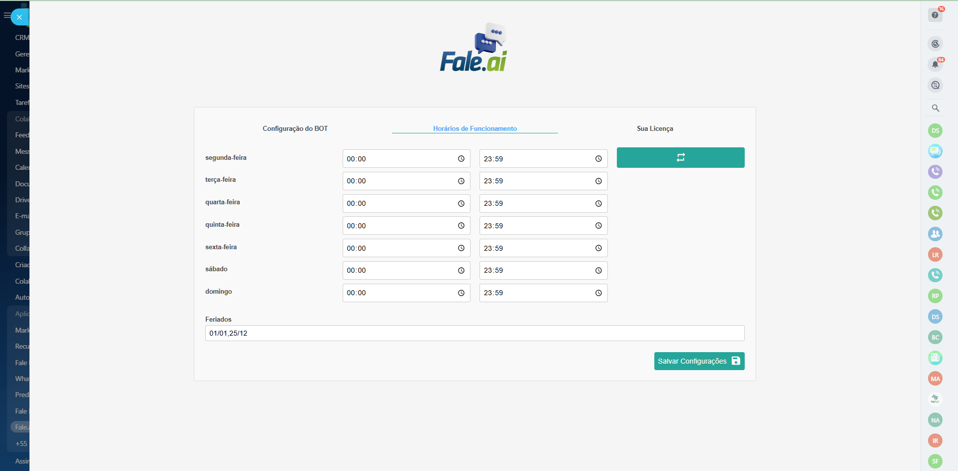 Defina seu horário de atendimento e feriados e o canal ou usuário para onde deve transferir nestes casos, diretamente no bot, ou permita que a IA atenda seus clientes 24 horas por dia.