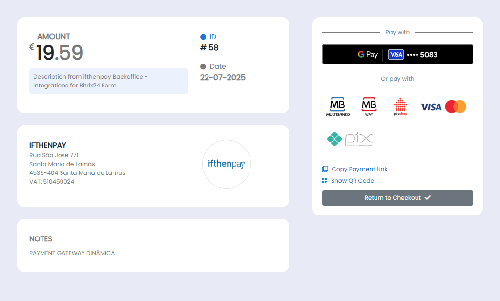Revolucione a forma como gere pagamentos no Bitrix24 com a ifthenpay. A nossa aplicação integra-se diretamente no seu CRM, permitindo que os seus clientes paguem, de forma conveniente, faturas, negócios e encomendas utilizando métodos de pagamento portugueses populares. Diga adeus a processos de pagamento fragmentados; com a ifthenpay pode aceitar todos os seus pagamentos através de uma única e poderosa integração. A aplicação suporta todos os cenários de pagamento habituais do Bitrix24, garantindo uma experiência simples e eficiente para o seu negócio.