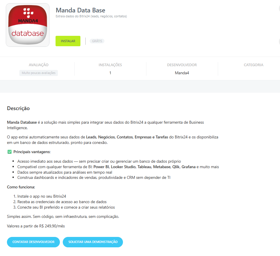 Manda Database é a solução mais simples para integrar seus dados do Bitrix24 a qualquer ferramenta de Business Intelligence.