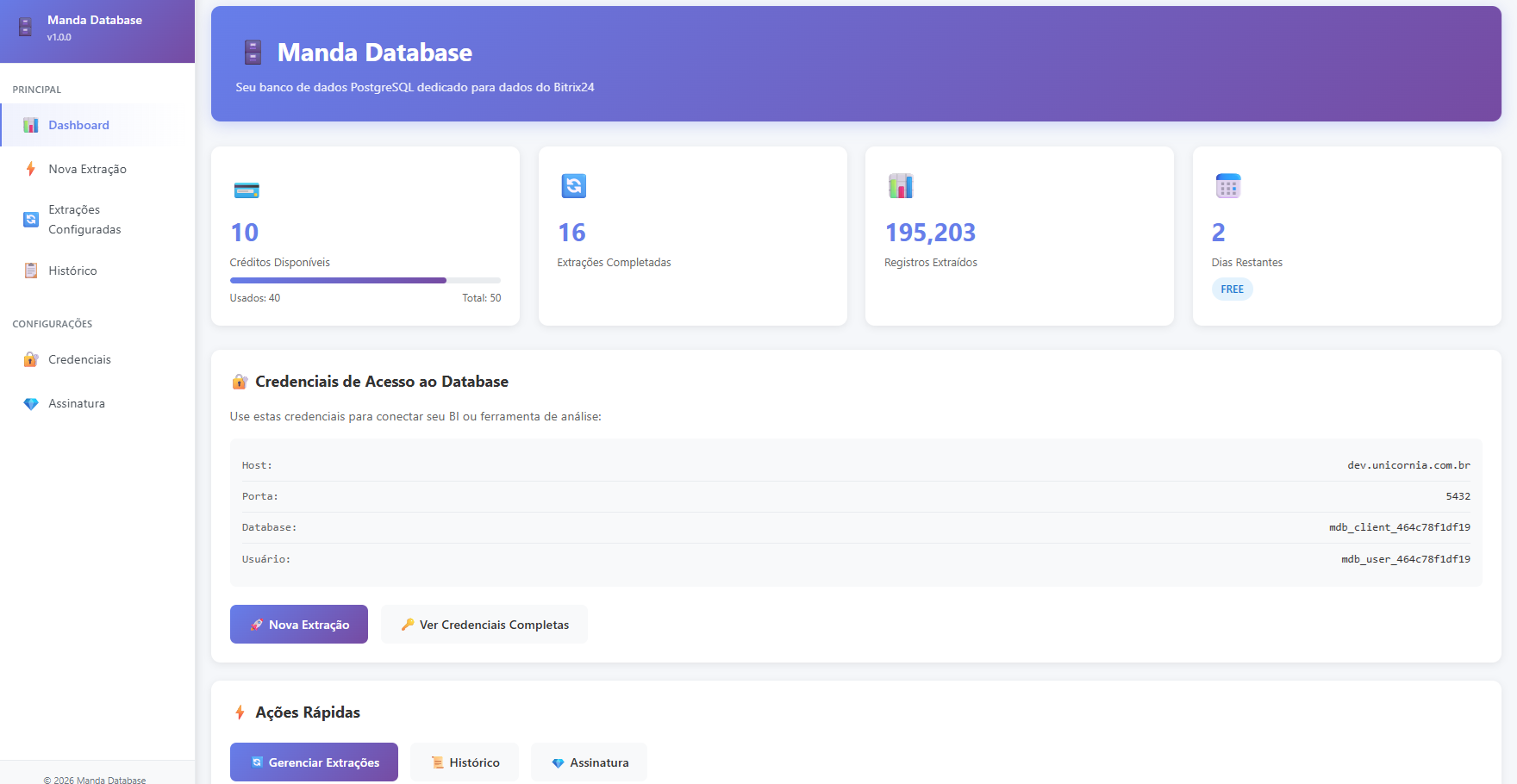 - Receba as credenciais de acesso ao banco de dados
