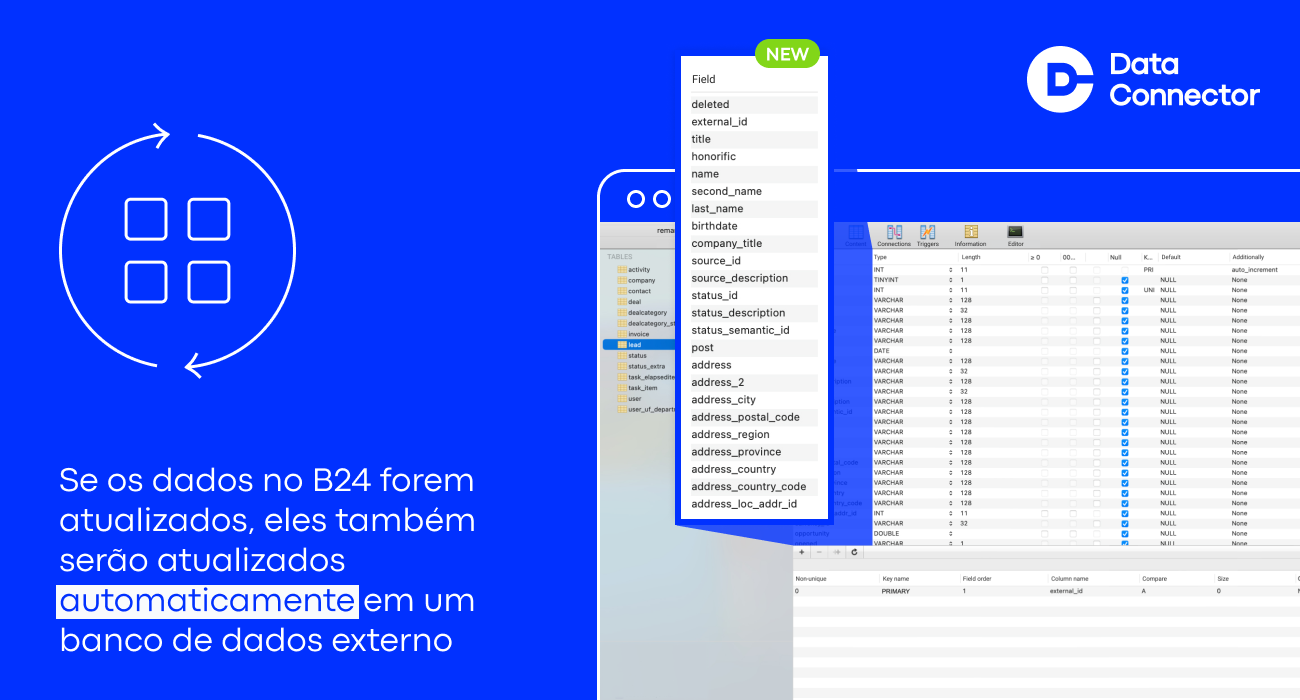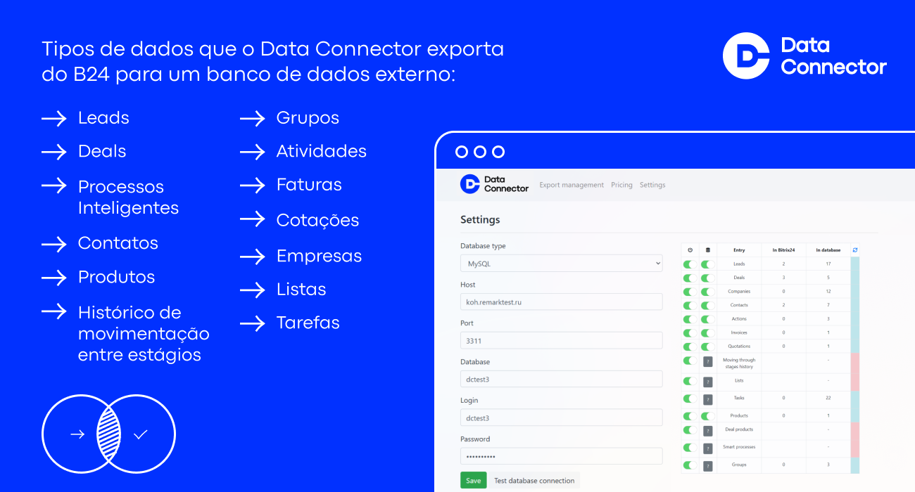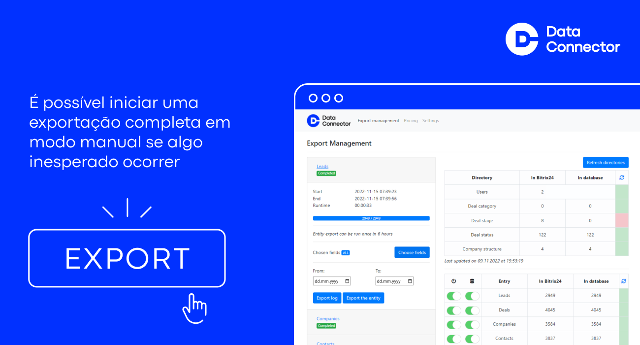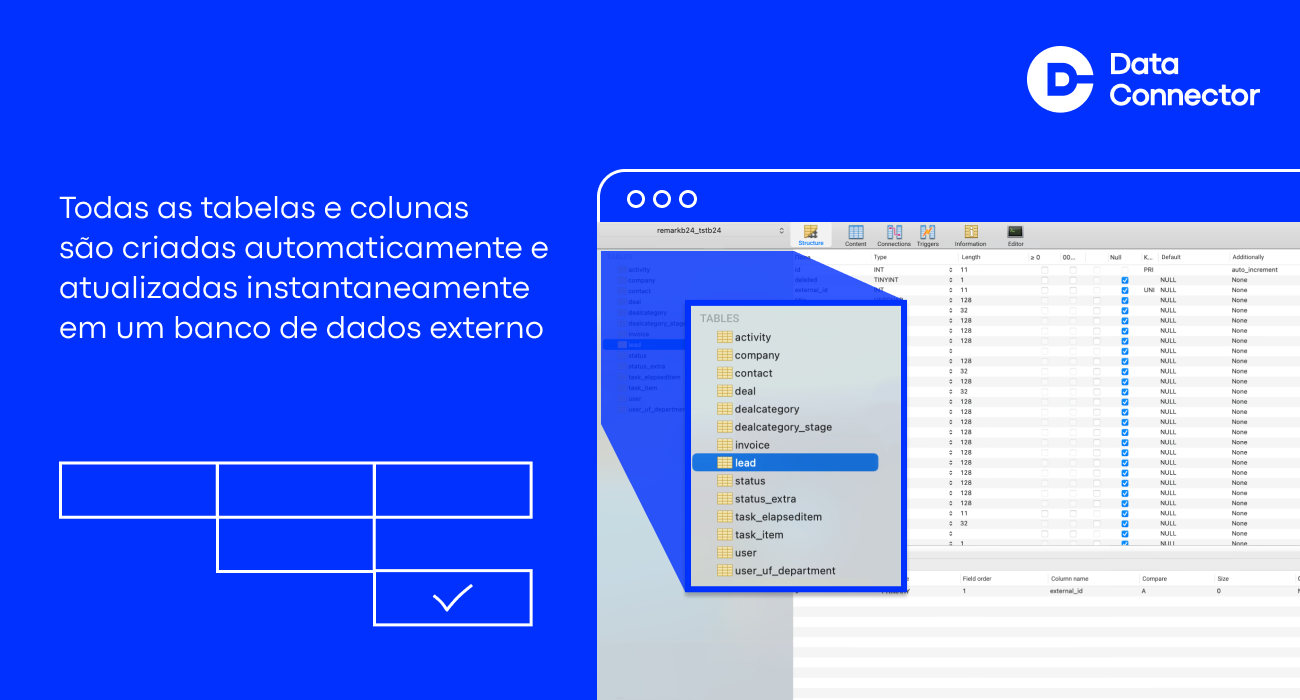 Inicialmente, o aplicativo precisa ser instalado na conta Bitrix24 e ser conectado a um banco de dados externo (MySQL). Após isso, o Data Connector começa a exportar todas as entidades selecionadas e campos necessários para a nuvem, atualizando-os em tempo real ou diariamente no horário definido. O usuário, tendo acesso total ao banco de dados analítico, se conecta a ele e trabalha com os dados de forma independente. Nosso serviço resolve a tarefa mais importante - exportar dados do sistema CRM.