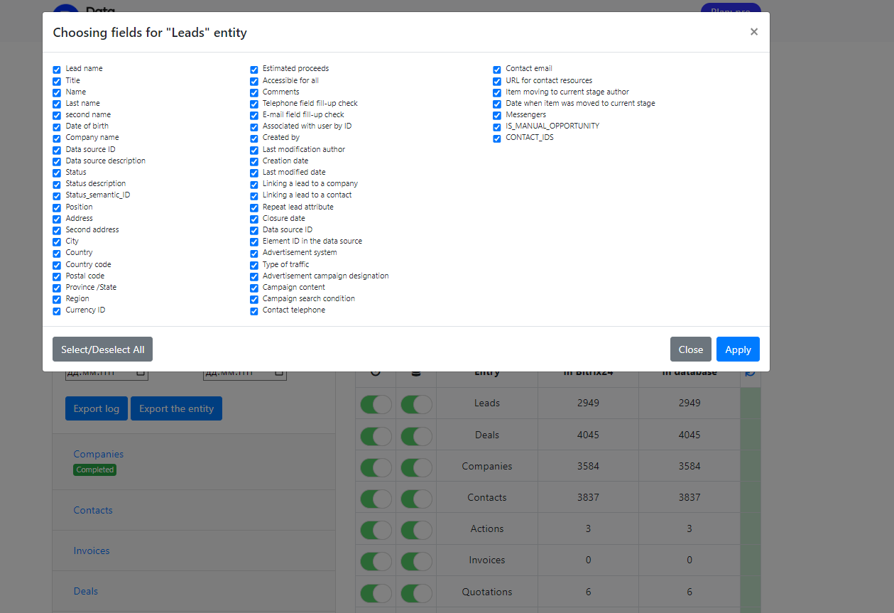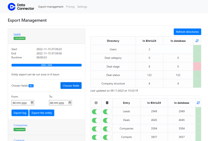 Inicialmente, o aplicativo precisa ser instalado na conta Bitrix24 e ser conectado a um banco de dados externo (MySQL). Após isso, o Data Connector começa a exportar todas as entidades selecionadas e campos necessários para a nuvem, atualizando-os em tempo real ou diariamente no horário definido. O usuário, tendo acesso total ao banco de dados analítico, se conecta a ele e trabalha com os dados de forma independente. Nosso serviço resolve a tarefa mais importante - exportar dados do sistema CRM.