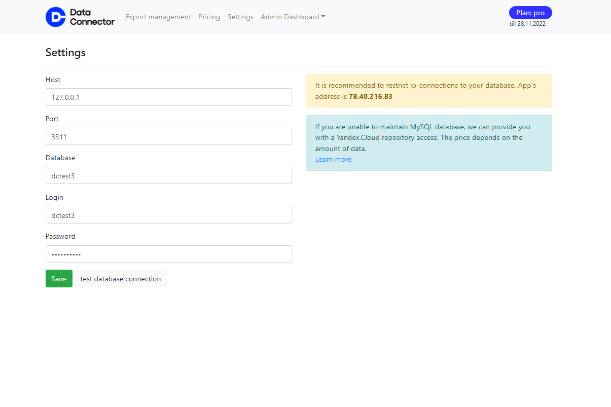 Para escolher o plano adequado, oferecemos acesso gratuito ao plano profissional por 14 dias. Isso permite que você exporte parte dos dados, se familiarize com a estrutura da exportação e, em seguida, escolha o melhor plano após o término do período de teste. Você tem acesso a toda a funcionalidade do nosso produto.