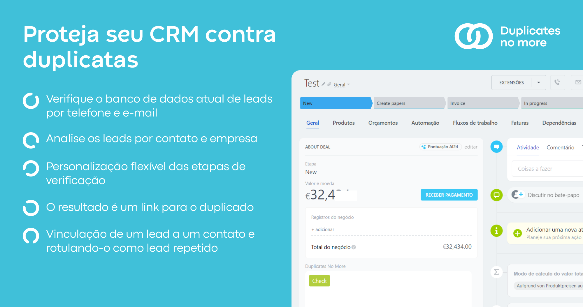 “Duplicates no more” é uma maneira confiável de proteger seu CRM de leads, negócios, contatos e empresas duplicadas. Quando o aplicativo detecta um duplicado, ele não permite que o contato avance no funil de vendas até que um funcionário o remova ou o una a um contato existente.