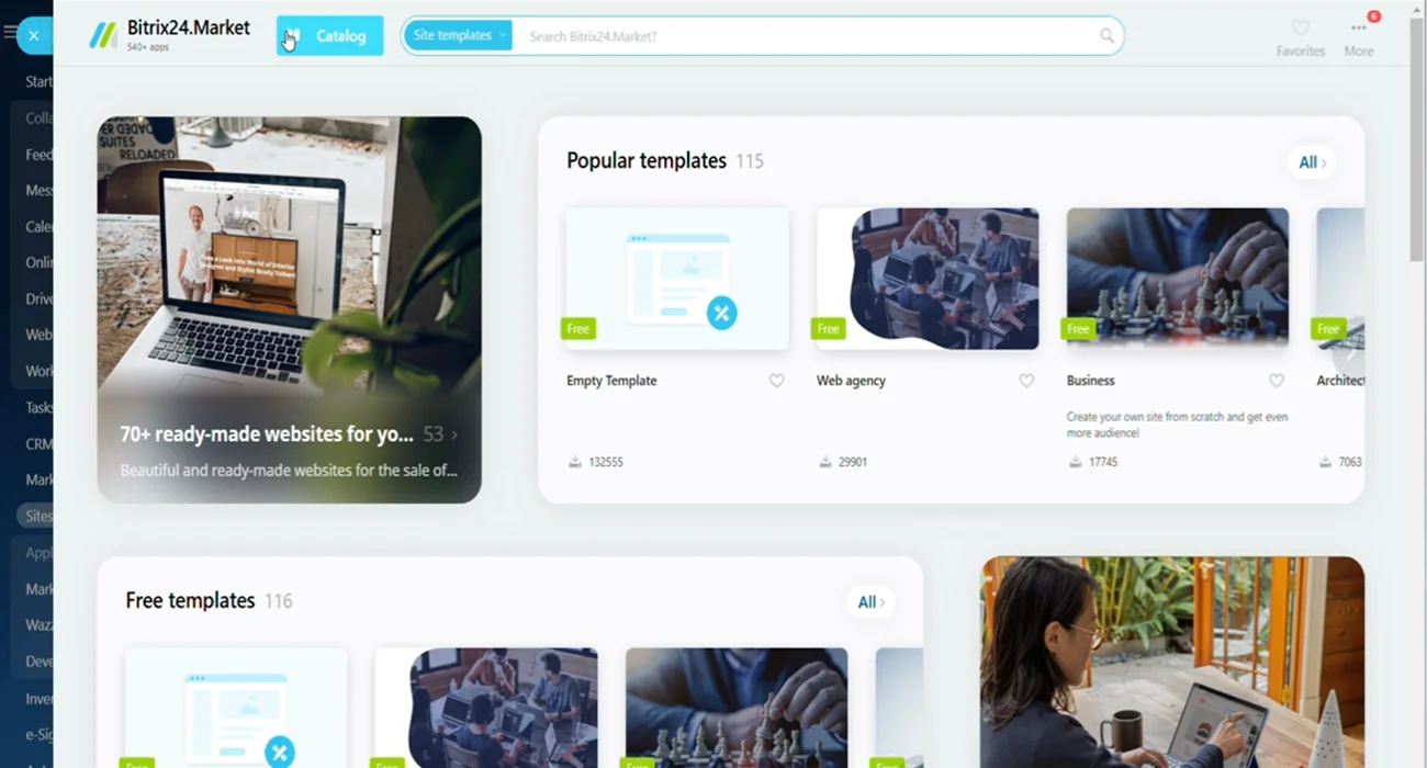 Para começar, o Bitrix24 tem uma poderosa ferramenta de criação de sites que contempla do mais básico até o mais complexo. Ali é possível criar um site bonito e funcional para a sua empresa, ou até mesmo sua própria loja virtual de e-commerces. Existem recursos para todos os gostos e necessidades – tudo isso sem precisar escrever uma única linha de código.