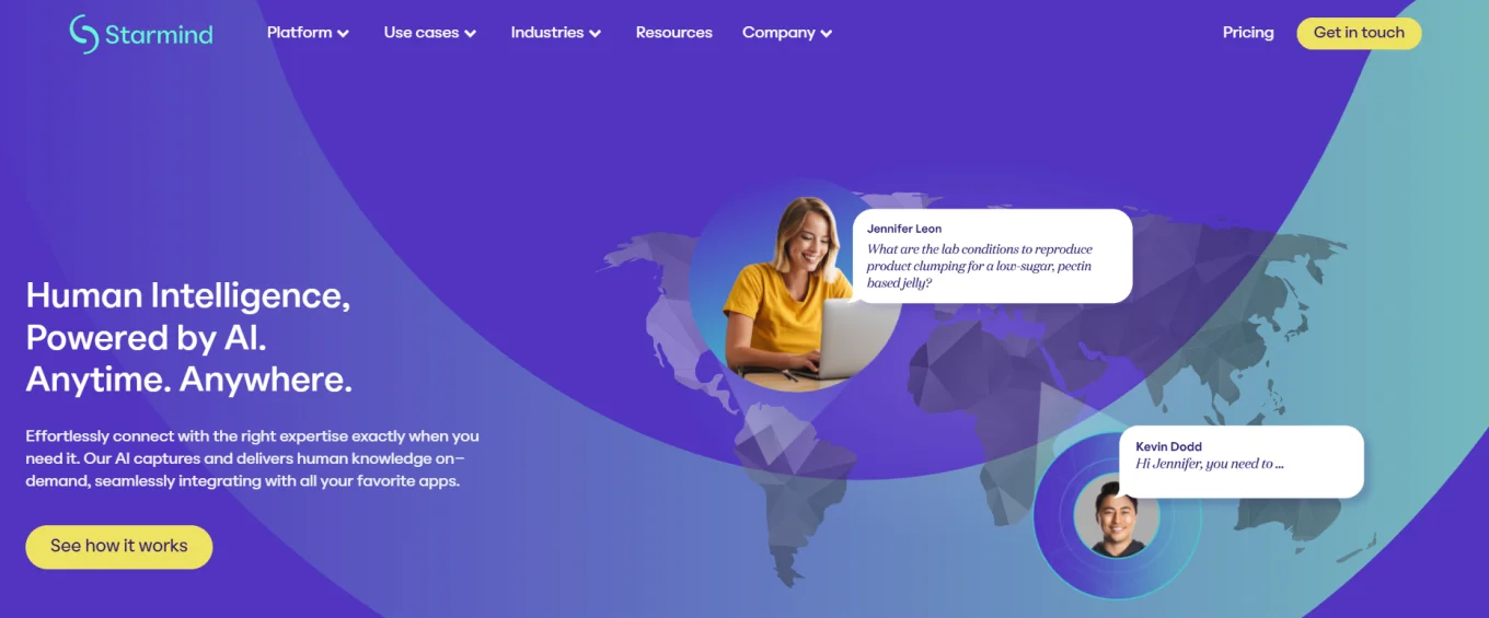 Starmind é uma plataforma de gestão do conhecimento que utiliza IA para conectar a expertise de uma equipe de forma dinâmica e produtiva. Suas principais funcionalidades são centradas no aprendizado de máquina, permitindo que o sistema sugira automaticamente respostas e recursos com base no capital de ideias acumulado, independentemente de onde ele esteja dentro da organização.
