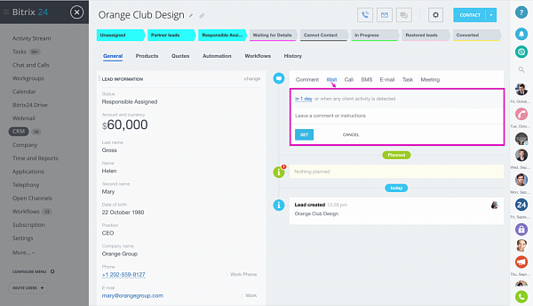 A regra de espera é uma nova regra de automação criada para deixar comentários ou instruções para os prospectos inativos quando qualquer atividade é detectada da parte deles ou para os novos prospectos 1 dia depois da data em que foram adicionados: