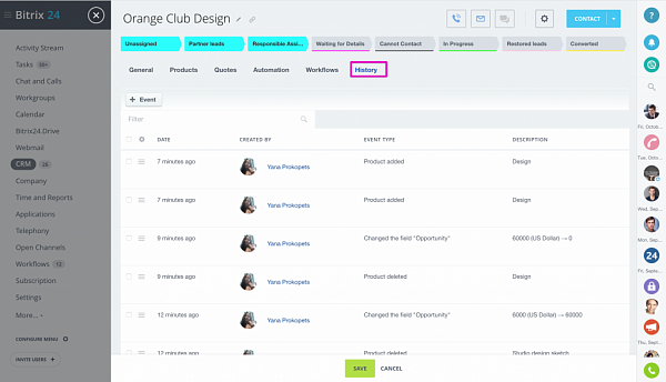 Todas as alterações feitas no registro do CRM são registradas na seção de Histórico: