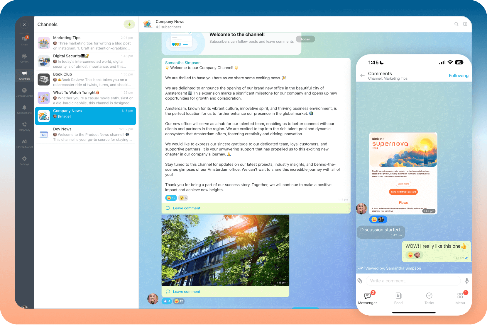 Os canais oferecem inúmeras maneiras novas e interessantes de comunicação no Bitrix24, tanto corporativas quanto informais. Crie um canal para anúncios da empresa, integração de funcionários ou notícias do setor para compartilhar informações de uma forma orgânica e envolvente.