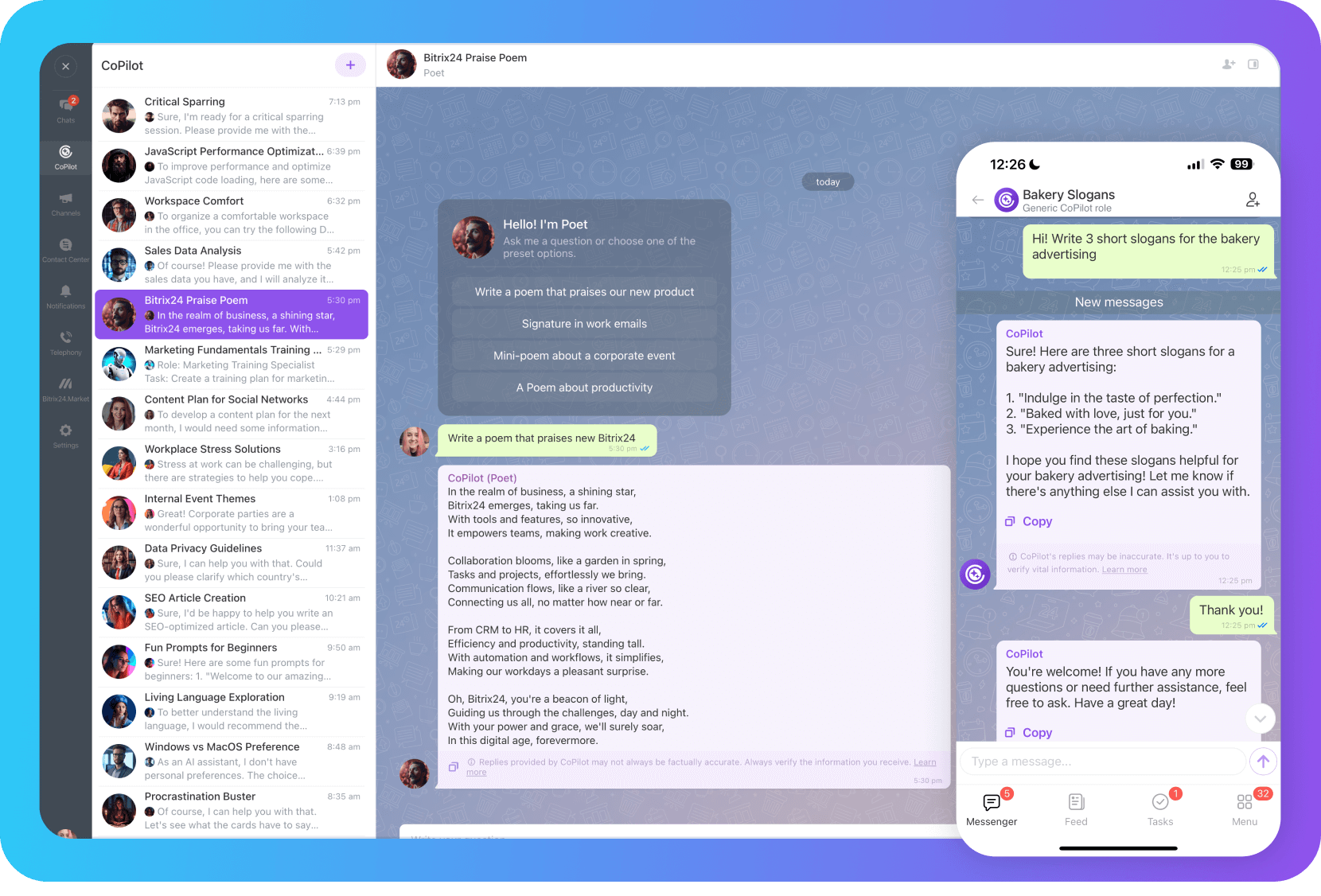 Muitas novas melhorias em nosso assistente com tecnologia de IA: biblioteca de prompts, funções do CoPilot, CoPilot móvel e muito mais.