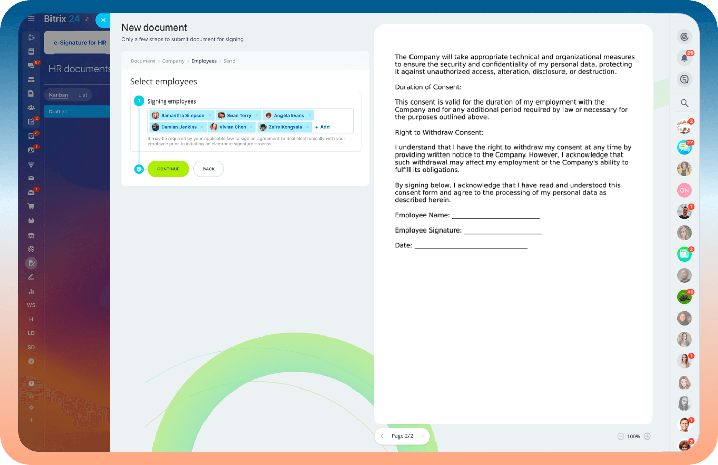 Um ótimo complemento ao nosso arsenal de ferramentas de automação, a assinatura eletrônica permite visualizar e assinar os documentos de RH da sua empresa diretamente no Bitrix24.