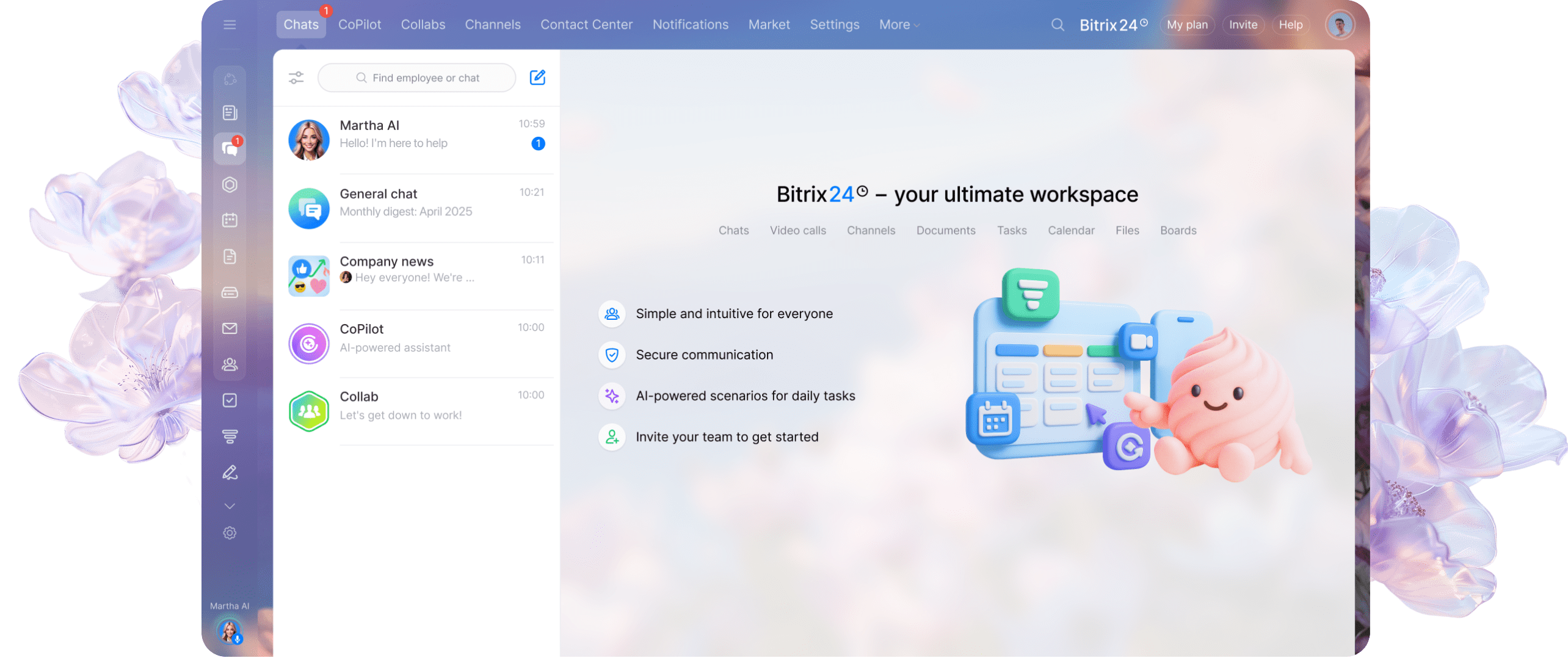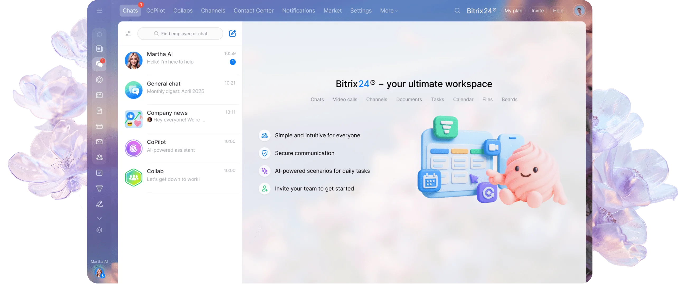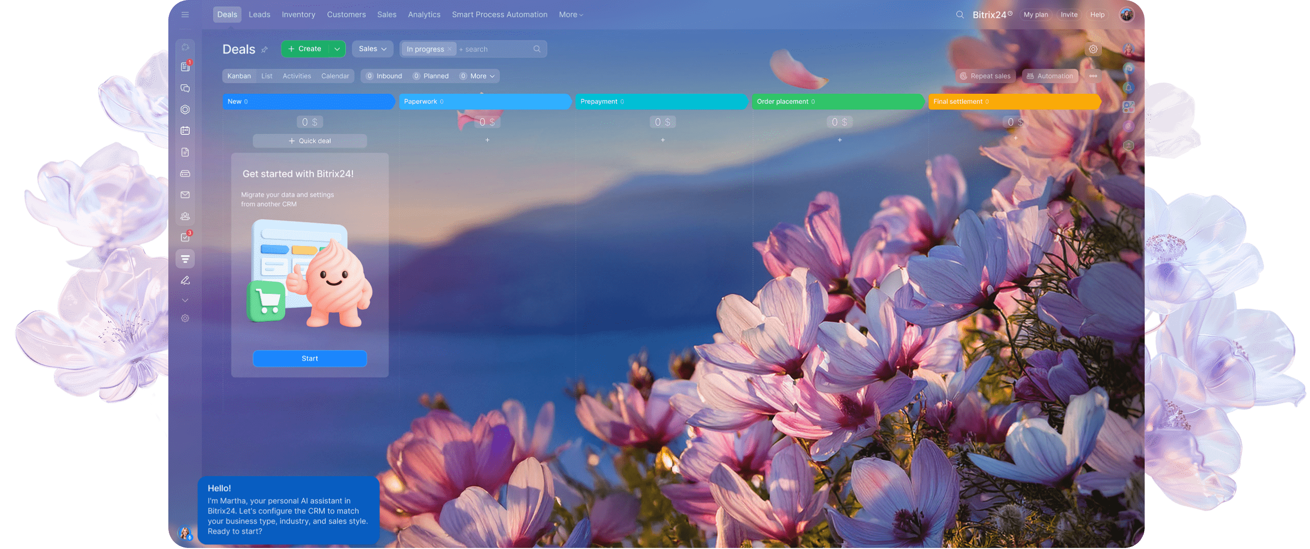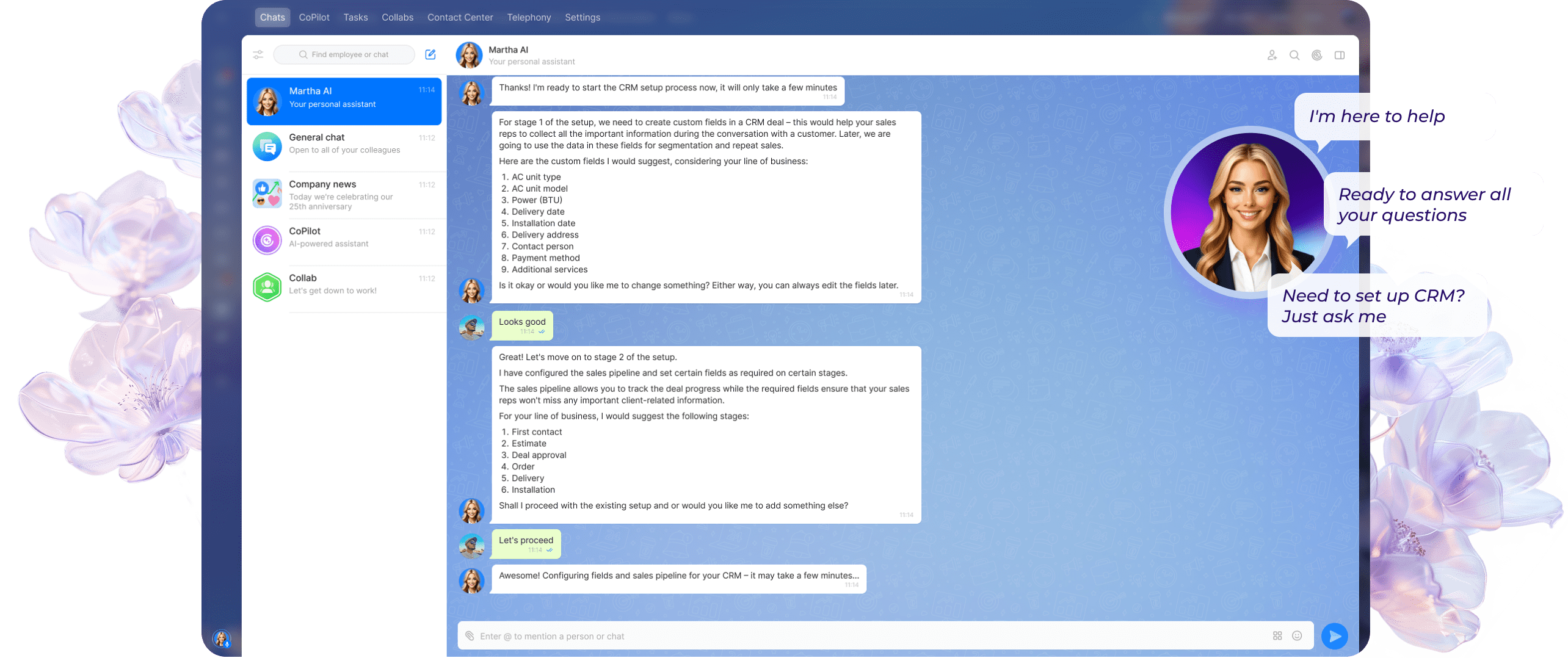 Martha é a sua nova parceira para realizar tarefas. Da integração de produtos à programação diária e configuração de ferramentas, esta assistente com tecnologia de IA está aqui para aliviar sua carga de trabalho e ajudar você (e seus colegas de equipe) a navegar no Bitrix24 com facilidade.