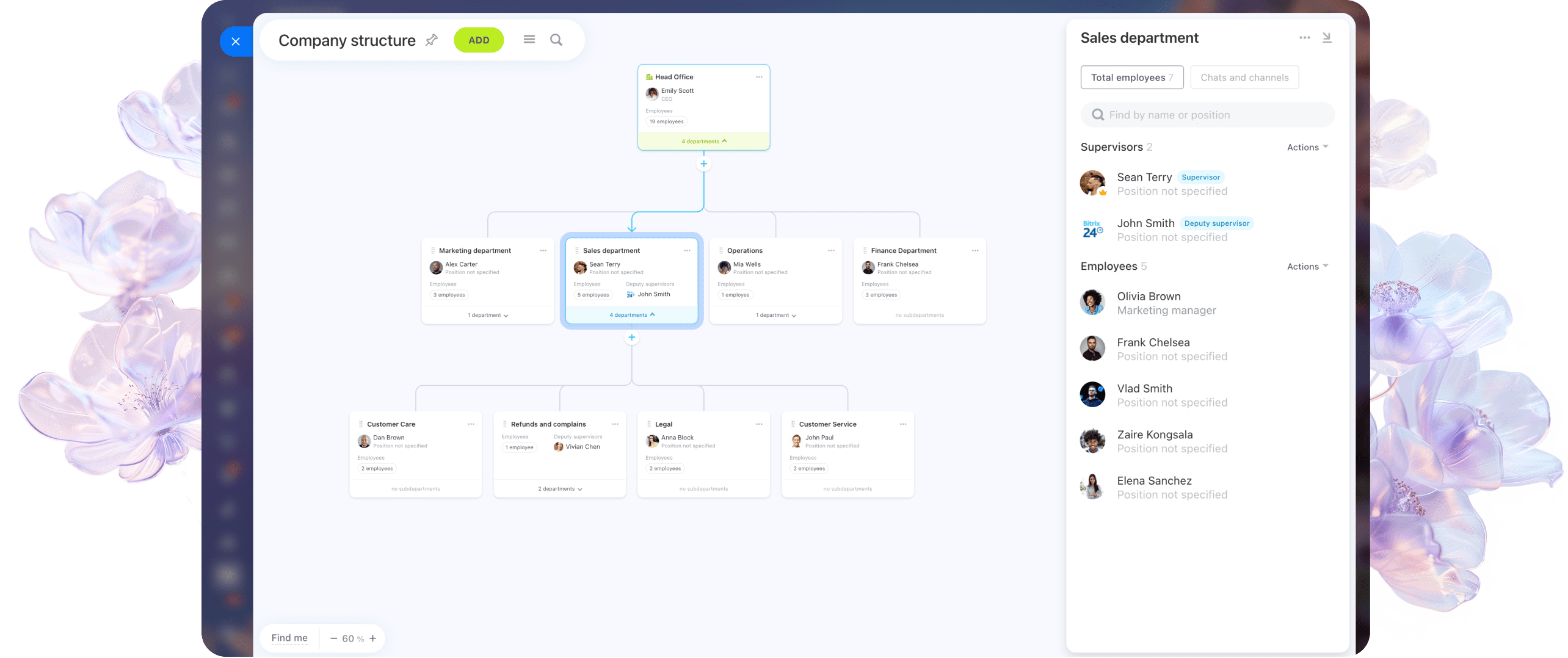 Visualize e edite o layout da sua empresa em um único gráfico interativo. Arraste e solte funcionários, departamentos ou funções para refletir instantaneamente a estrutura real da sua equipe.