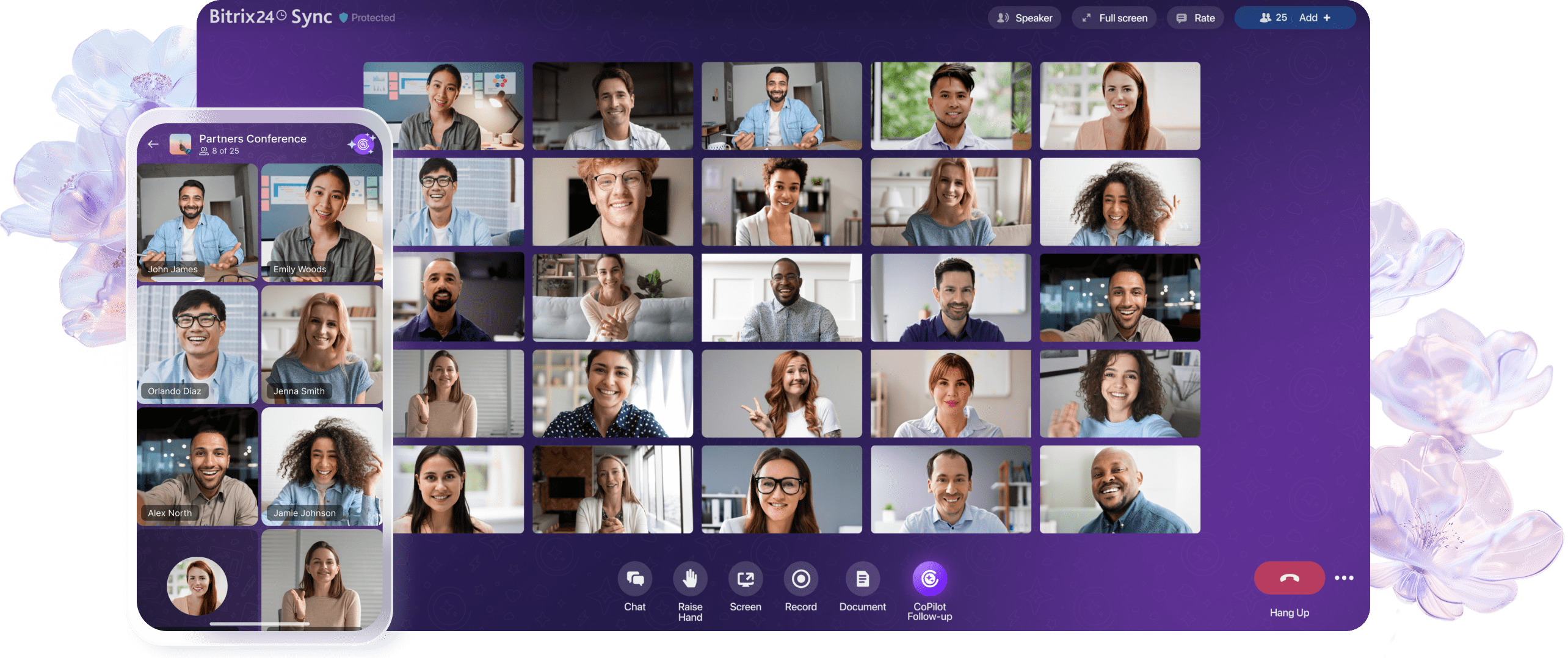 Inicie uma chamada instantaneamente a partir de um chat, tarefa, negócio ou evento do calendário. Silencie, ative ou destaque pessoas durante uma chamada, mesmo em grandes reuniões on-line com centenas de participantes.