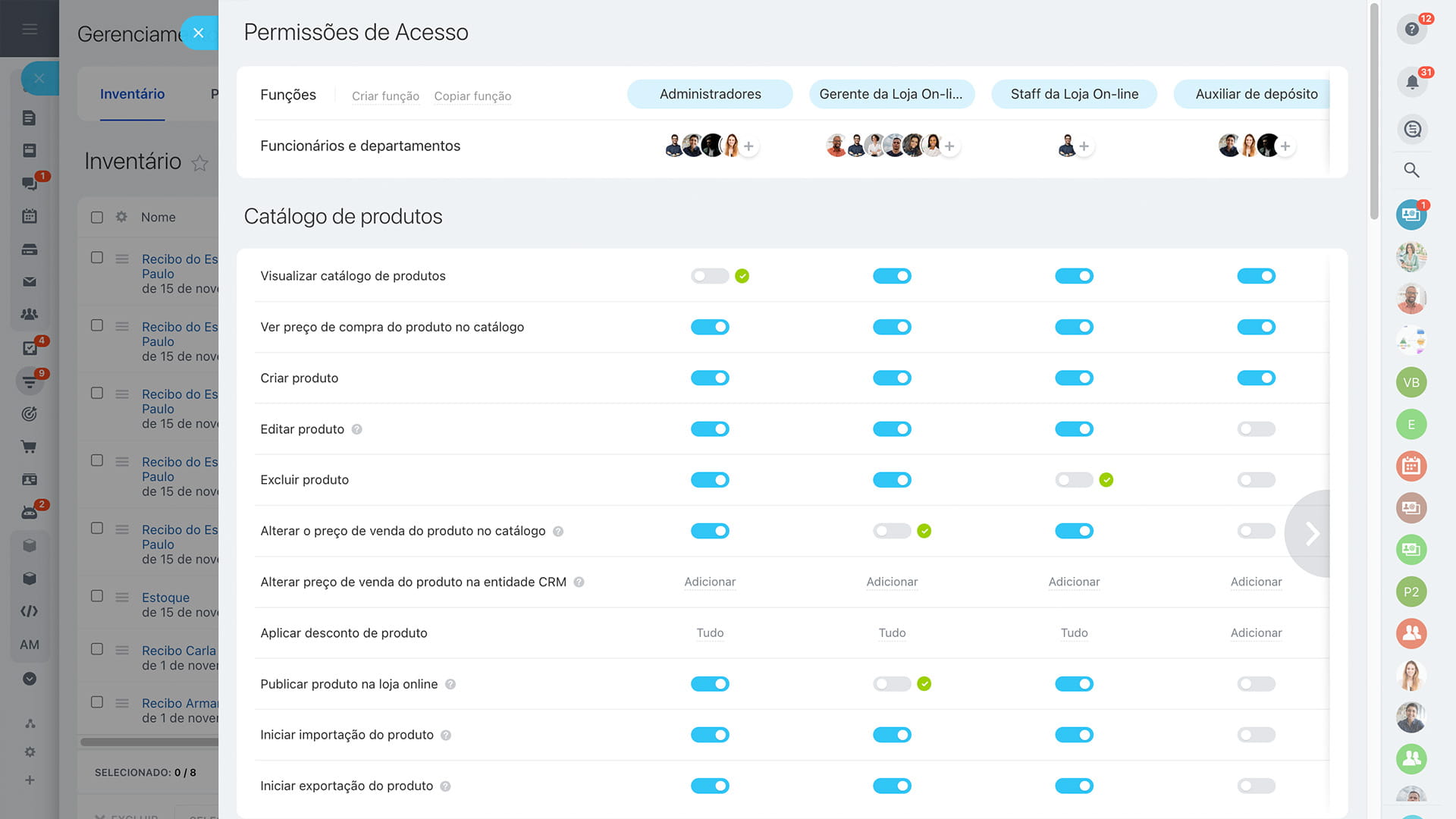 Determine o nível ideal de acesso para cada um de seus funcionários. Você pode decidir quem poderá criar novos produtos, editar produtos existentes, editar preços, aplicar descontos e assim por diante. As permissões de acesso no Catálogo do Bitrix24 podem ser usadas para:
