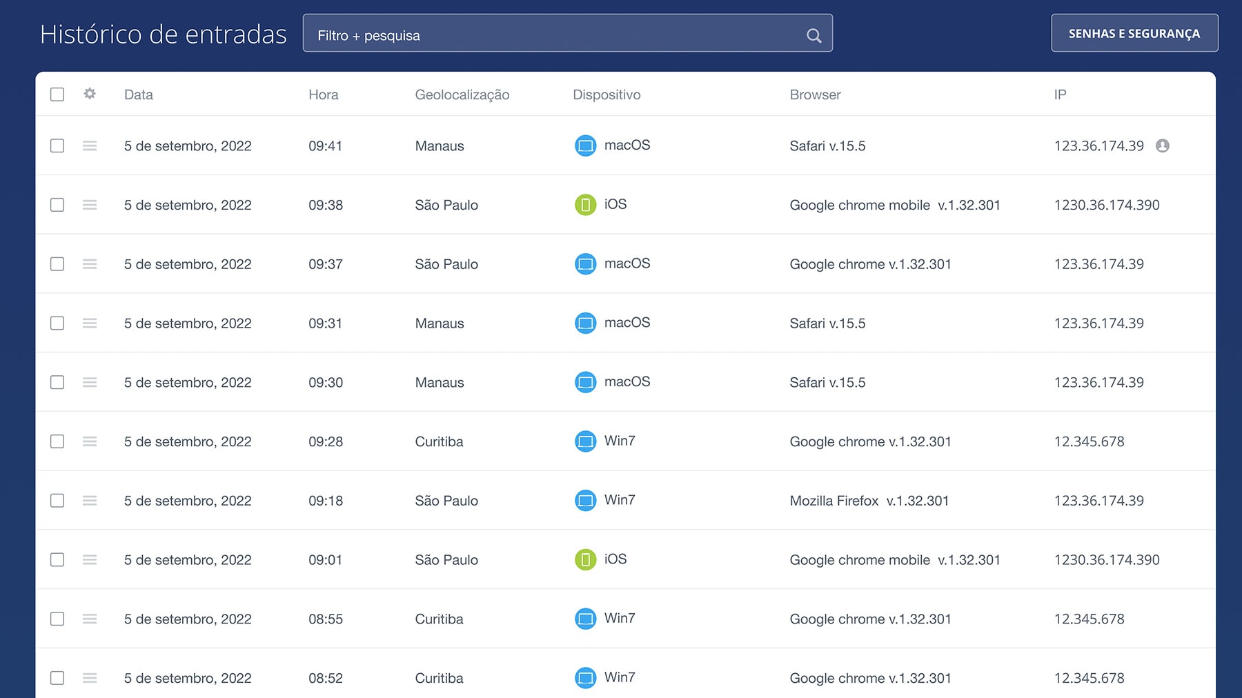 O histórico de login contém dados sobre todas as tentativas de login na sua conta: hora, geolocalização, tipo de dispositivo/plataforma e navegador. Isso ajuda a manter a conta segura e a proteger dados pessoais e corporativos contra acesso não autorizado.
