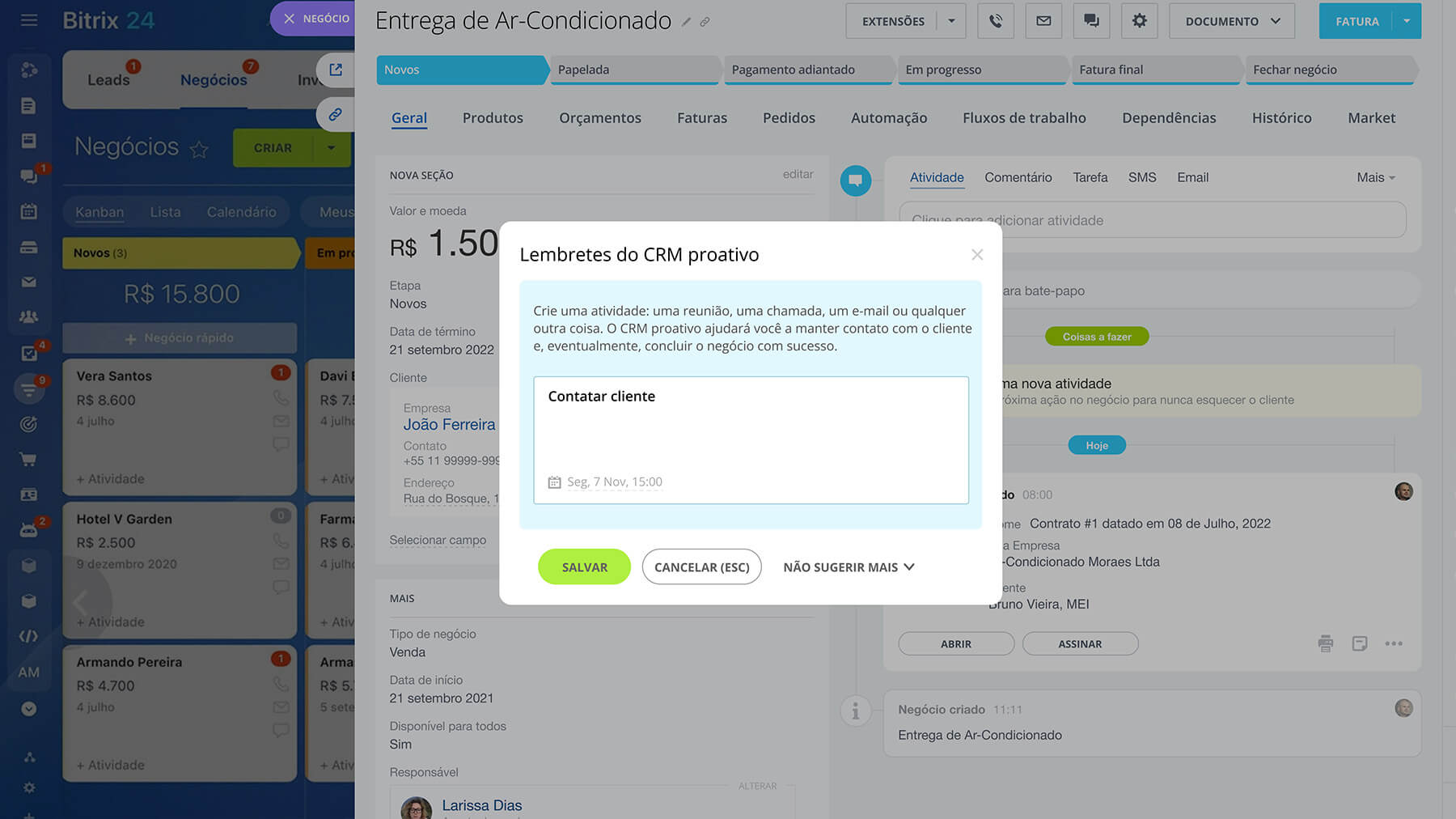 - Acompanhe o histórico e as atividades do negócio na Timeline (incluindo ouvir as chamadas gravadas e editar o negócio em movimento – preencha os campos, edite etapas e muito mais)