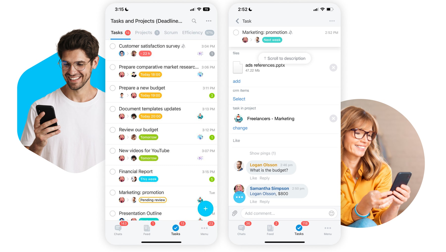 Gerencie seu trabalho, sua equipe e seus clientes em qualquer lugar com o aplicativo móvel Bitrix24.