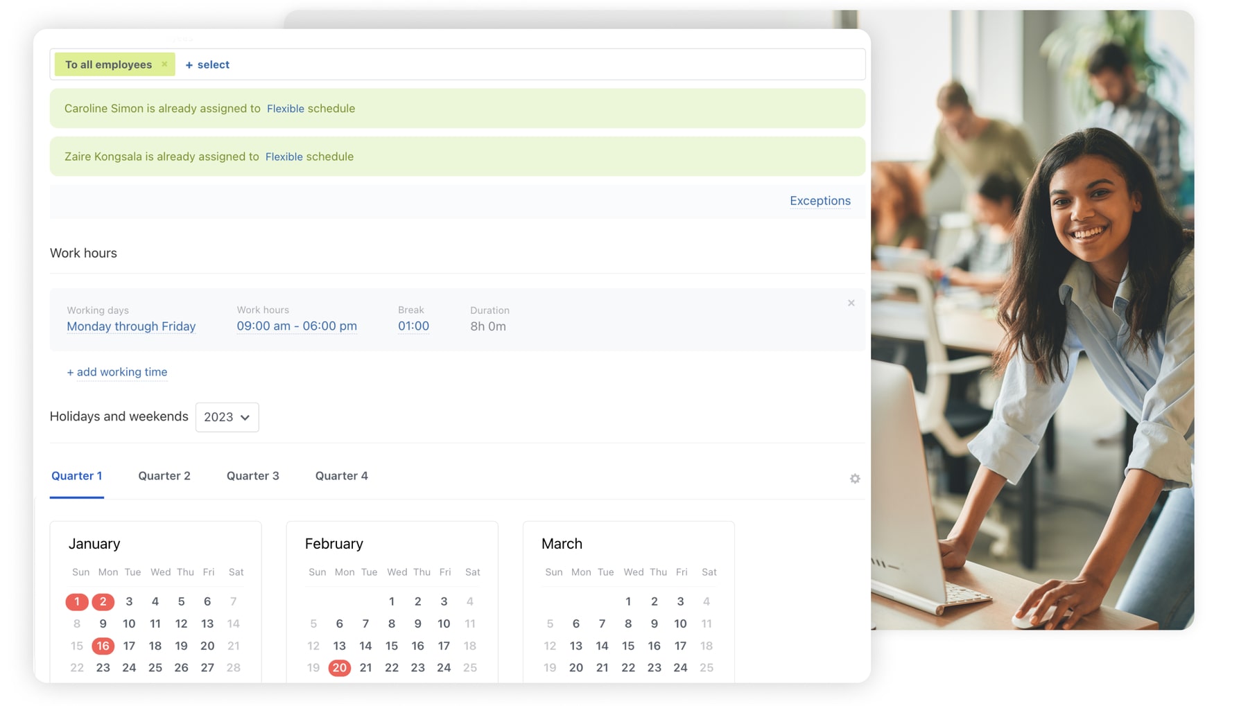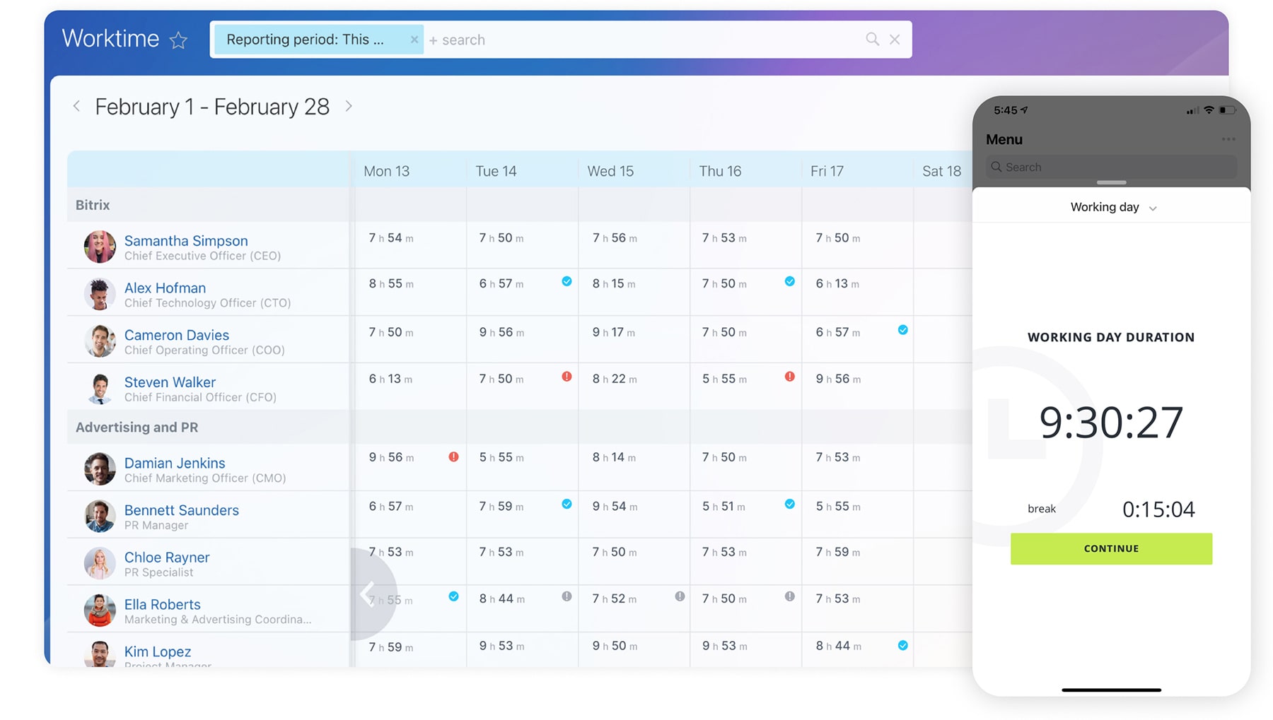 Mantenha o controle de todas as informações dos funcionários em um só lugar. Os funcionários podem monitorar suas horas de trabalho, gerenciar calendários e atualizar anotações nas ferramentas de gerenciamento de projetos.