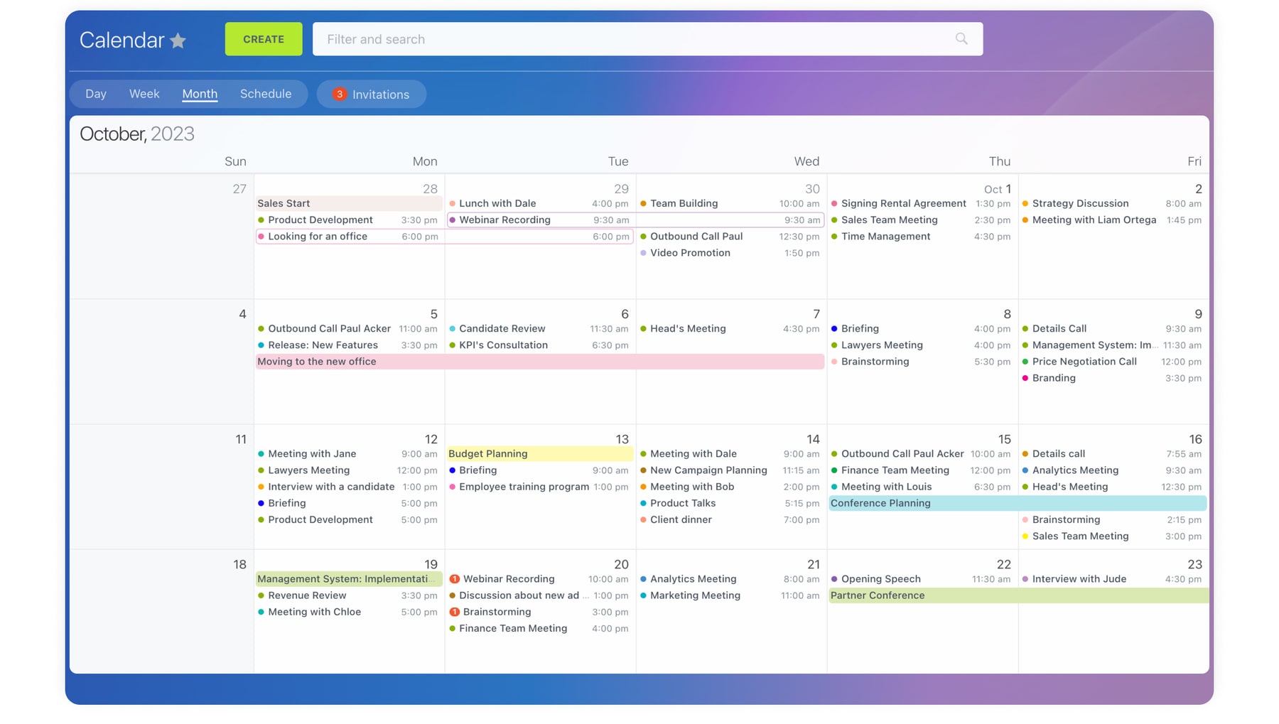 Compartilhe eventos com outras pessoas ou mantenha um calendário pessoal para se organizar e administrar bem o tempo. Os calendários compartilhados ajudam a manter todos informados, facilitando o gerenciamento do funil de vendas.