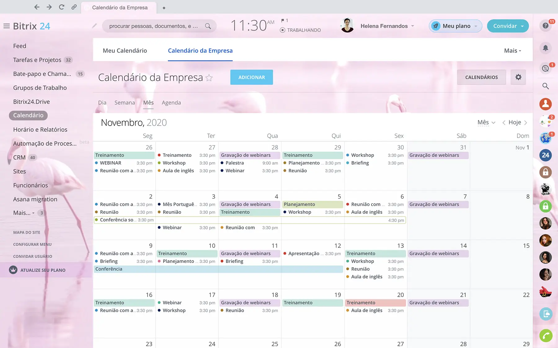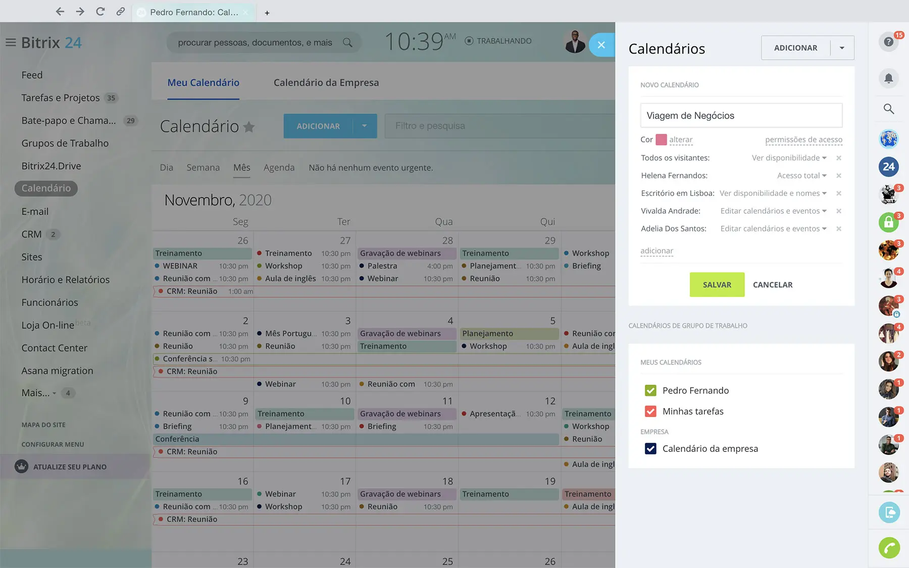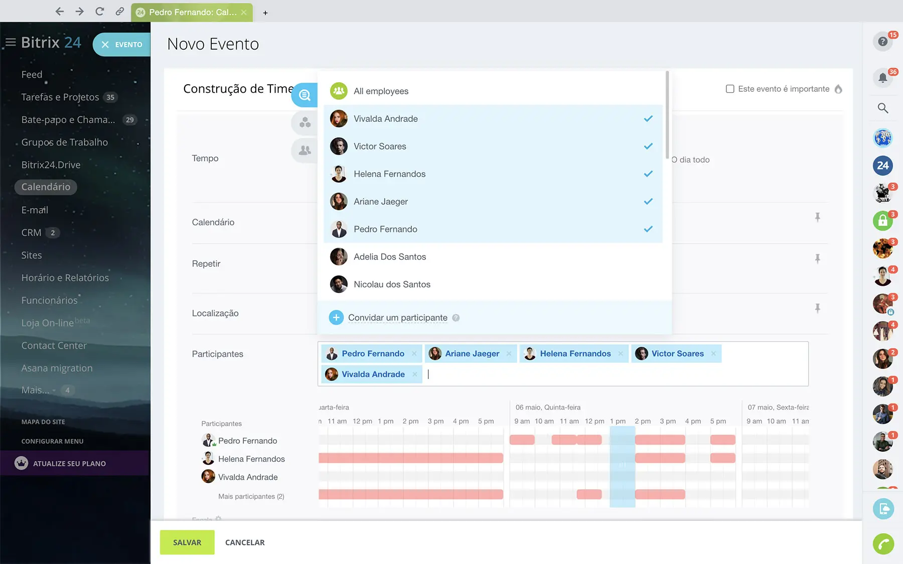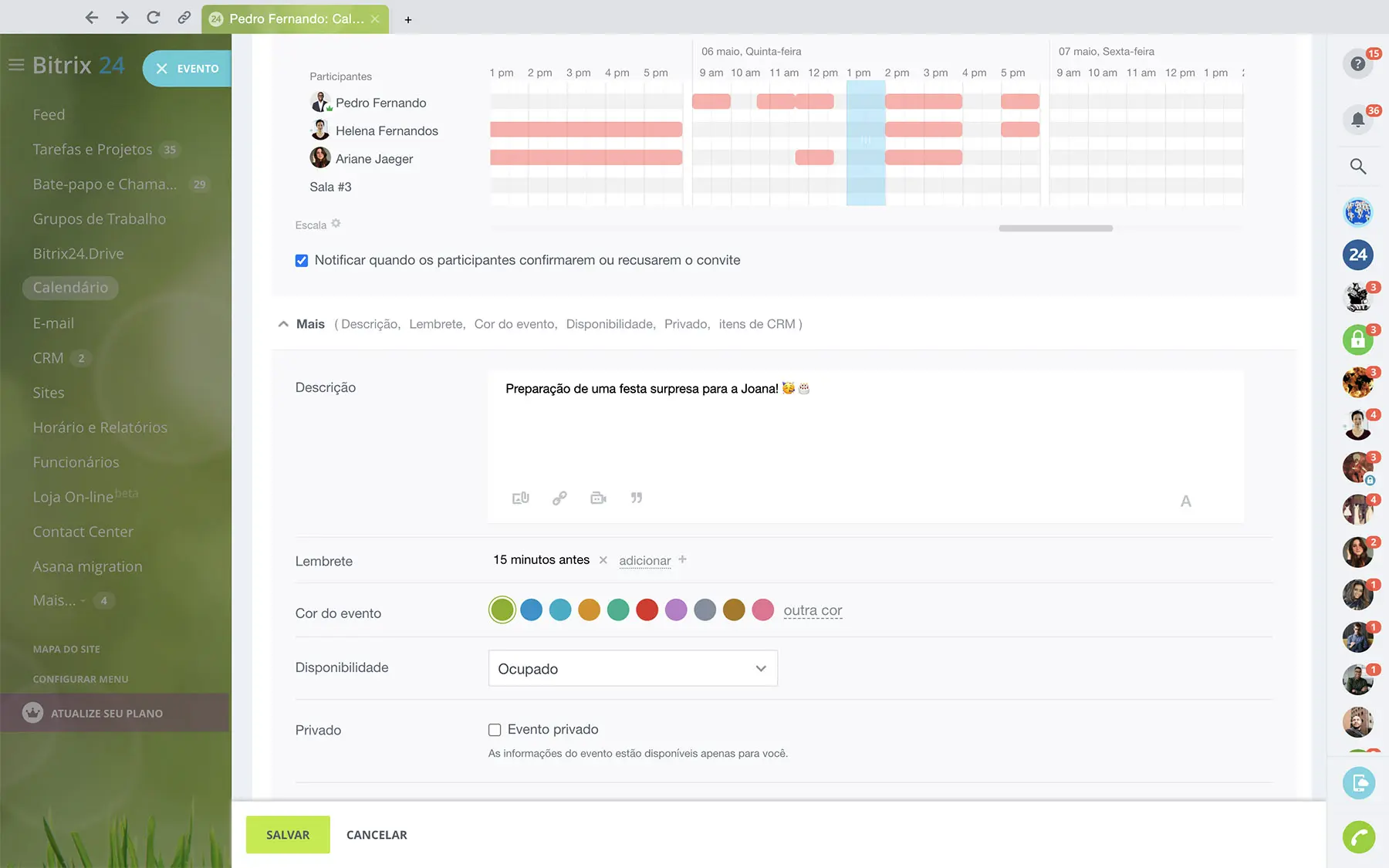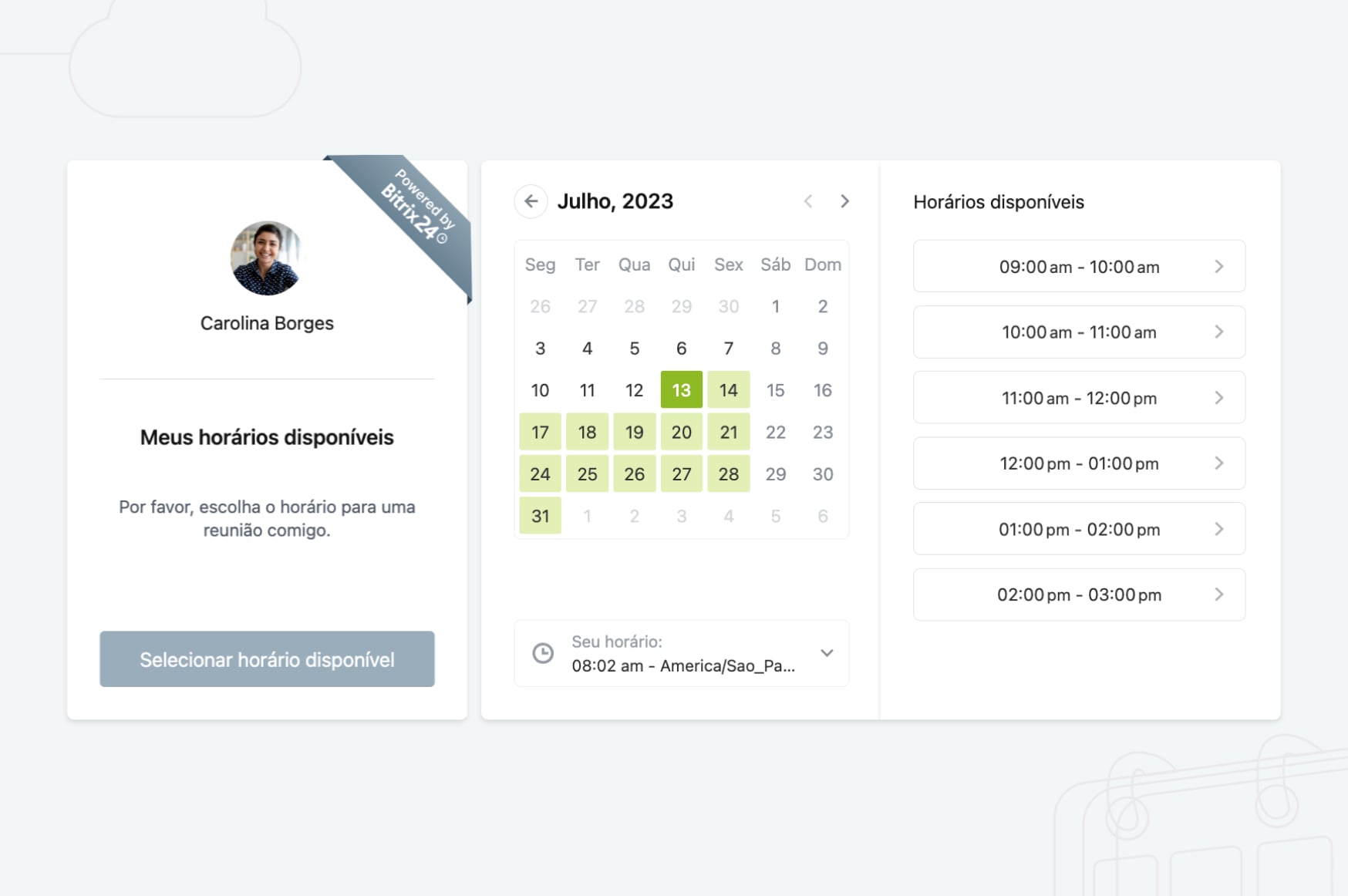 Os horários disponíveis no Bitrix24 eliminam a necessidade de troca interminável de mensagens (“Você pode às 9h? Não? Que tal às 10h?”) e permite que você organize reuniões em grupo facilmente.