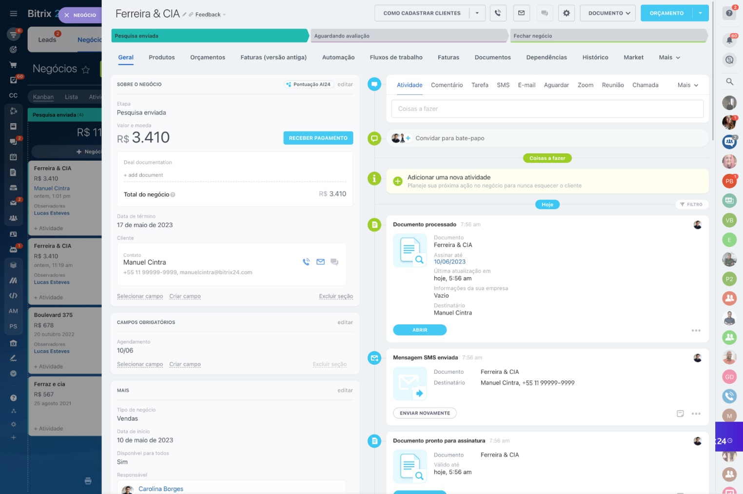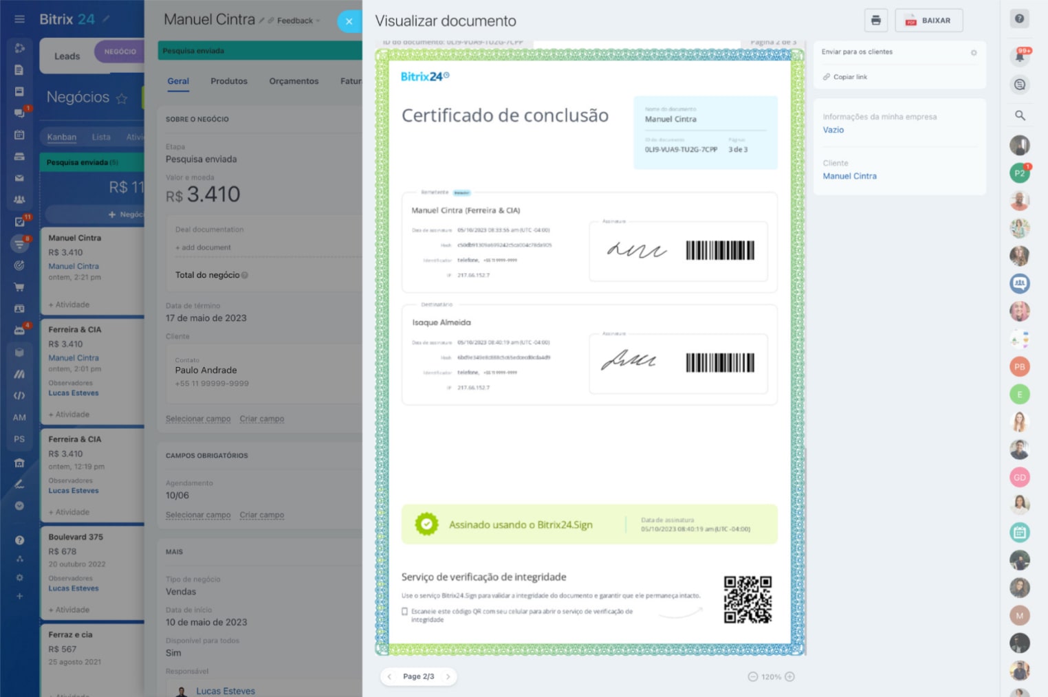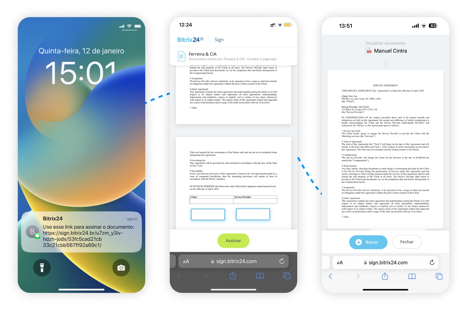 Assine documentos on-line de forma rápida e fácil. Trabalhe sem papel com apenas um clique. Poupe tempo, dinheiro e até mesmo árvores! Sempre que você precisar obter um documento assinado por um cliente ou contratado, basta enviar um link por e-mail, SMS ou WhatsApp (não é necessário criar uma conta Bitrix24).