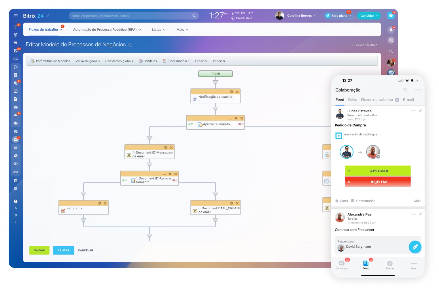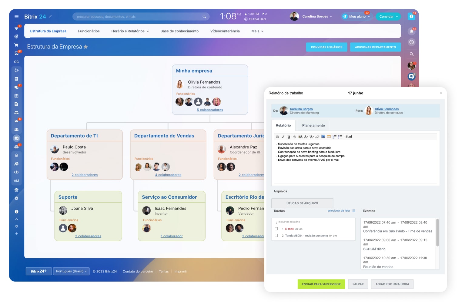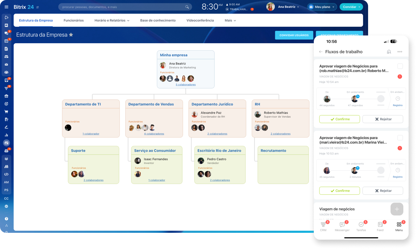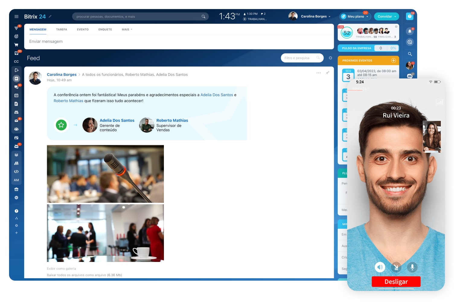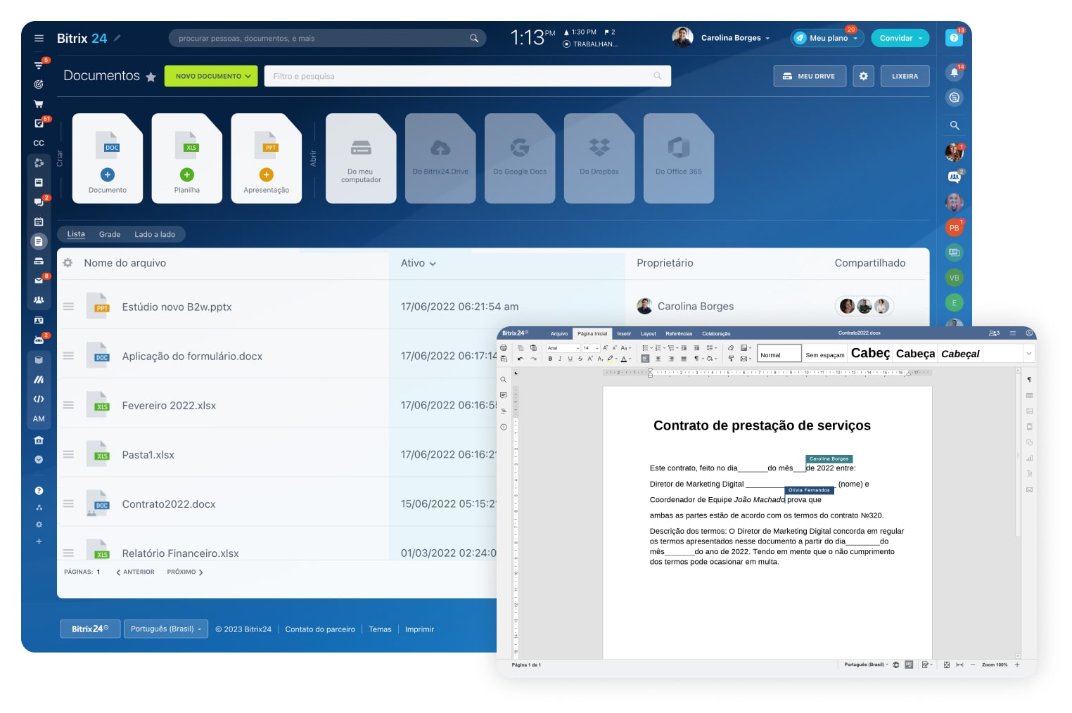 Além de várias ferramentas de gestão de RH e automação do fluxo de trabalho, o Bitrix24 oferece CRM, gerenciamento de tarefas, bate-papo, chamadas de vídeo, armazenamento de arquivos, calendário, documentos on-line e muito mais.