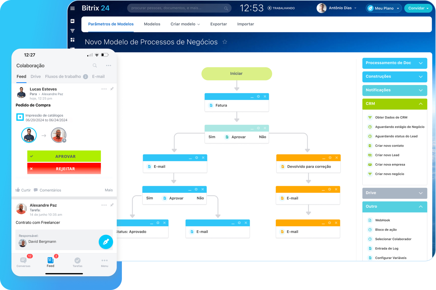 Confira os vários componentes e ferramentas que integram o RH e automação do Bitrix24. Integrados e interligados, todos trabalham como parte de um único ecossistema.