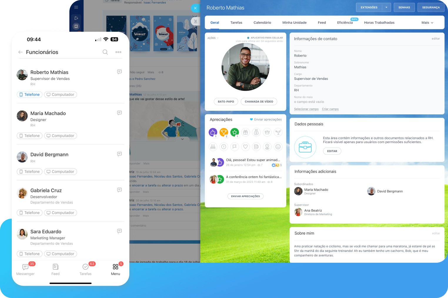 Gerencie sua equipe em qualquer lugar usando o aplicativo móvel: todos os seus bate-papos, chamadas de vídeo, tarefas, reuniões, comentários, perfis de funcionários e documentos estão aqui.