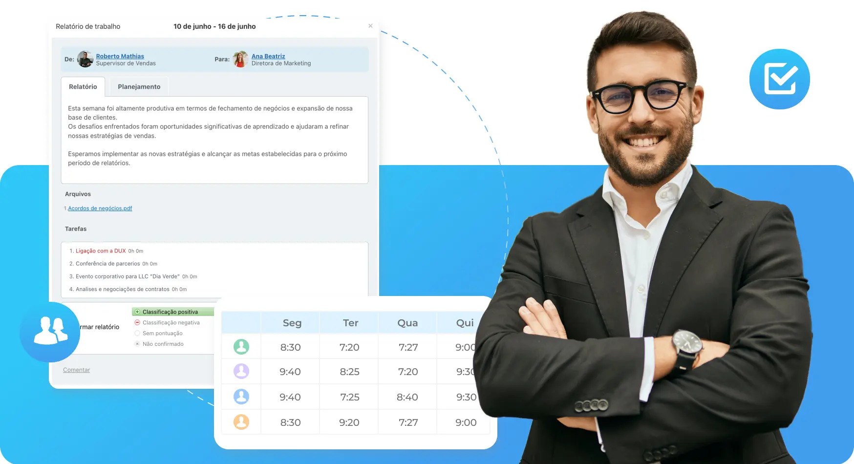 Todas as ferramentas que você precisa para gerenciar sua equipe e o trabalho: relatórios de tarefas, gerenciamento da carga de trabalho, KPI, controle das horas de trabalho e muito mais.