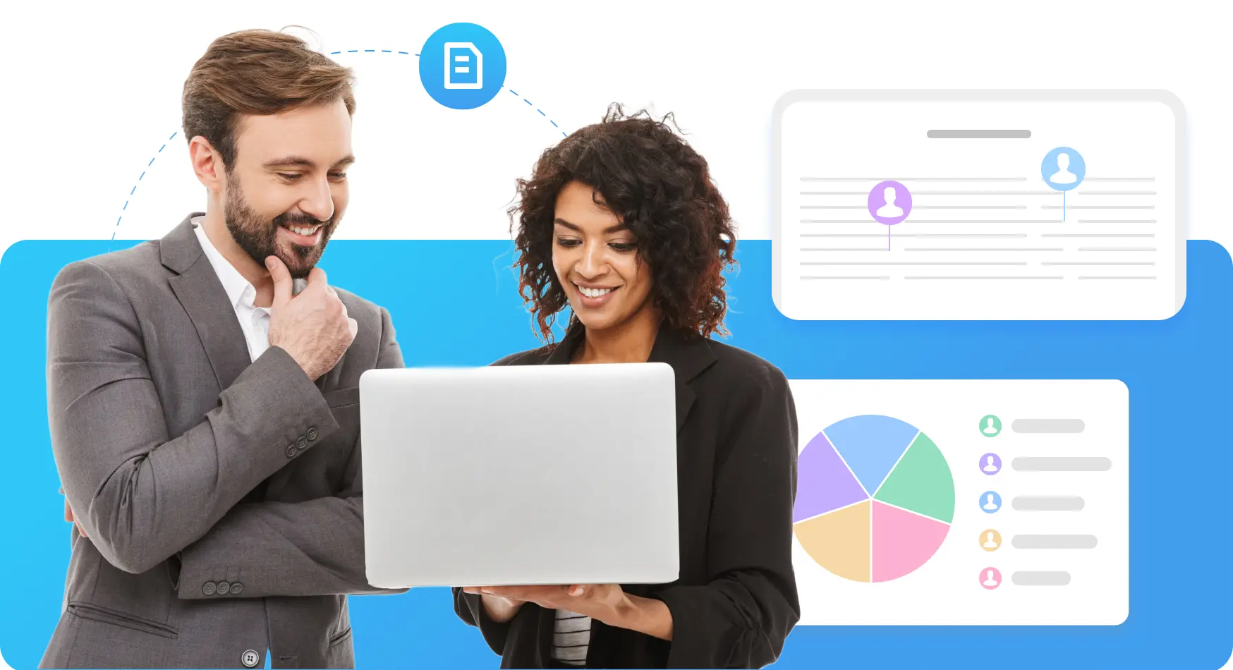 Gerencie os dados da empresa e da equipe usando bases de conhecimento, armazenamento de arquivos, documentos de texto on-line, planilhas, apresentações e muito mais.