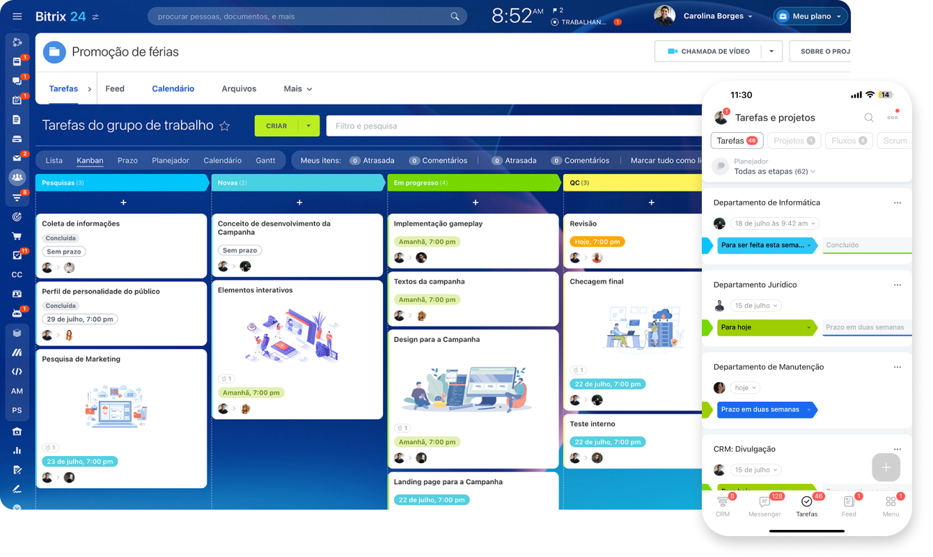 O Bitrix24 oferece todas as ferramentas mais usadas de gerenciamento de tarefas como parte de uma única plataforma. Escolha as que você se sente mais confortável e comece a trabalhar em conjunto com sua equipe.
