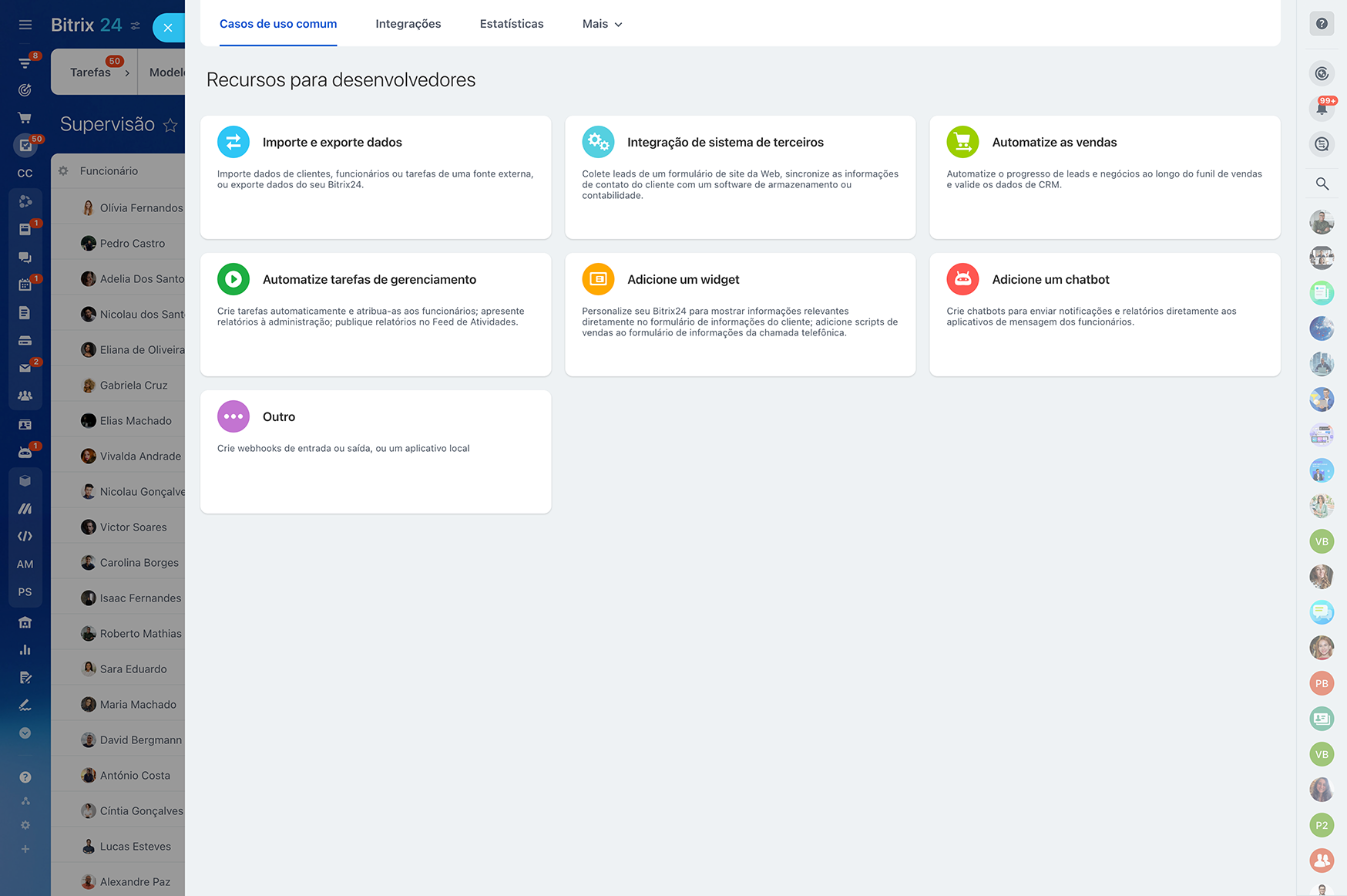 Usando as integrações de API REST do Bitrix24, você pode obter cenários personalizados de automação de tarefas que não estão disponíveis por meio das regras e gatilhos padrão.