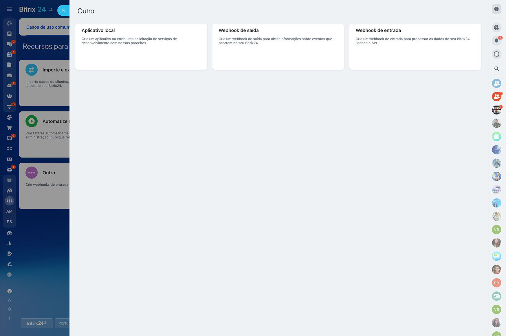 Os webhooks de saída permitem que você obtenha informações sobre os eventos no Bitrix24. Para processar dados do Bitrix24 usando a API, você pode criar um webhook de entrada.