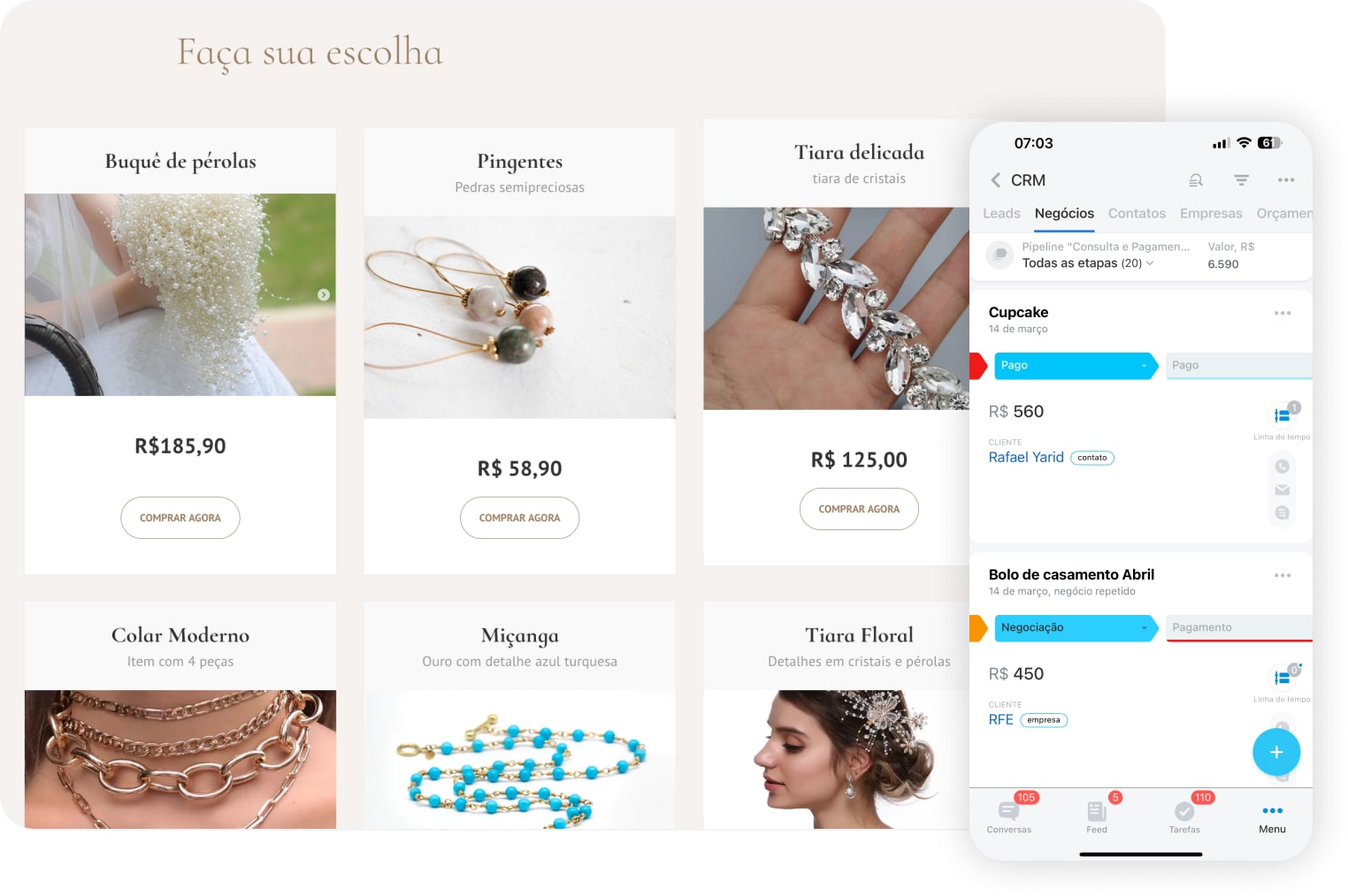 Crie uma loja on-line integrada com CRM, catálogo de produtos, gerenciamento de inventário, pagamentos e muito mais.