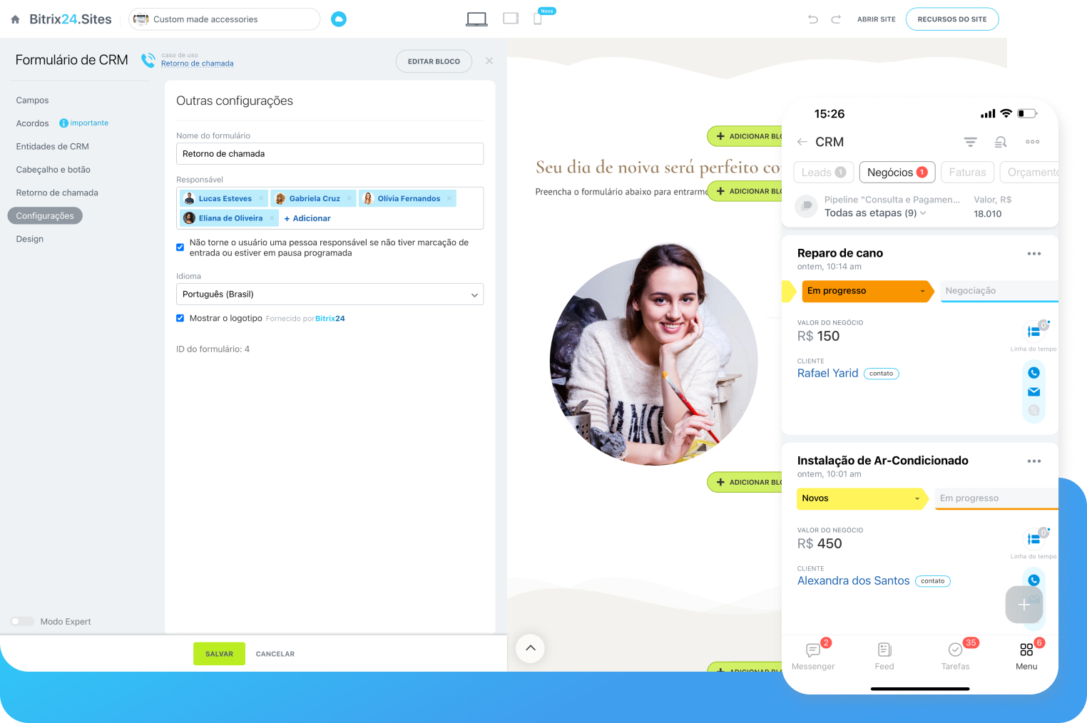 Todos os sites criados no Bitrix24 são 100% compatíveis com dispositivos móveis, responsivos e repletos de ferramentas de comércio eletrônico.